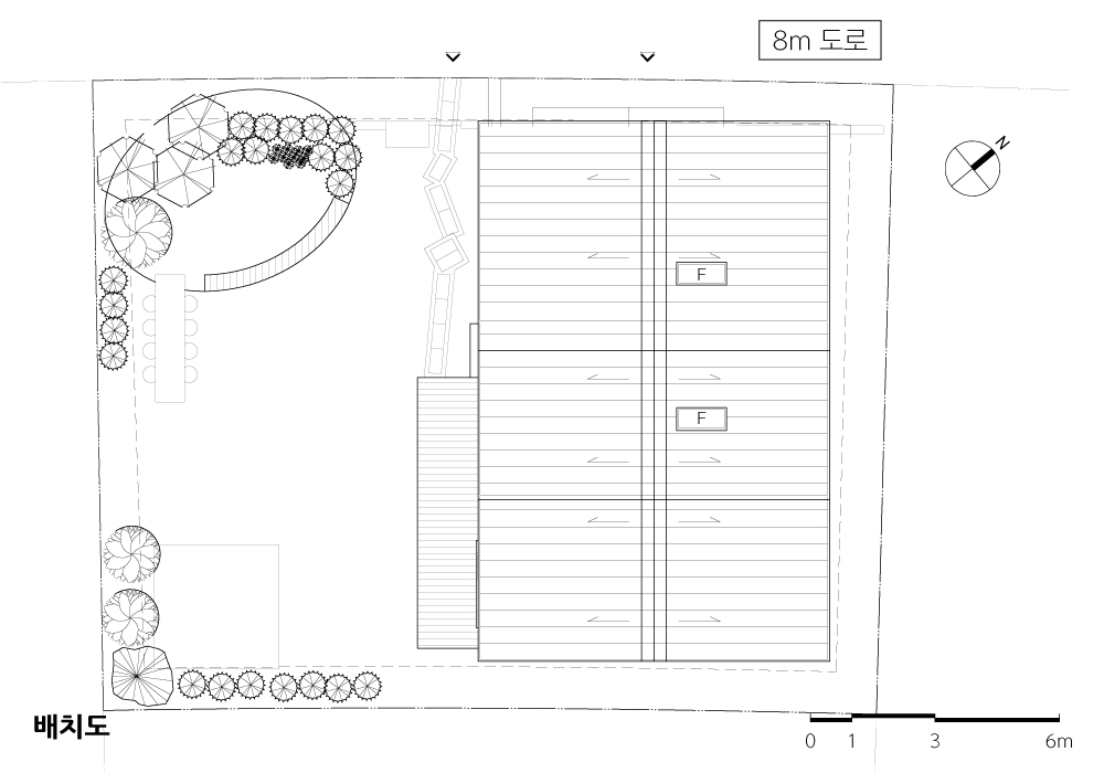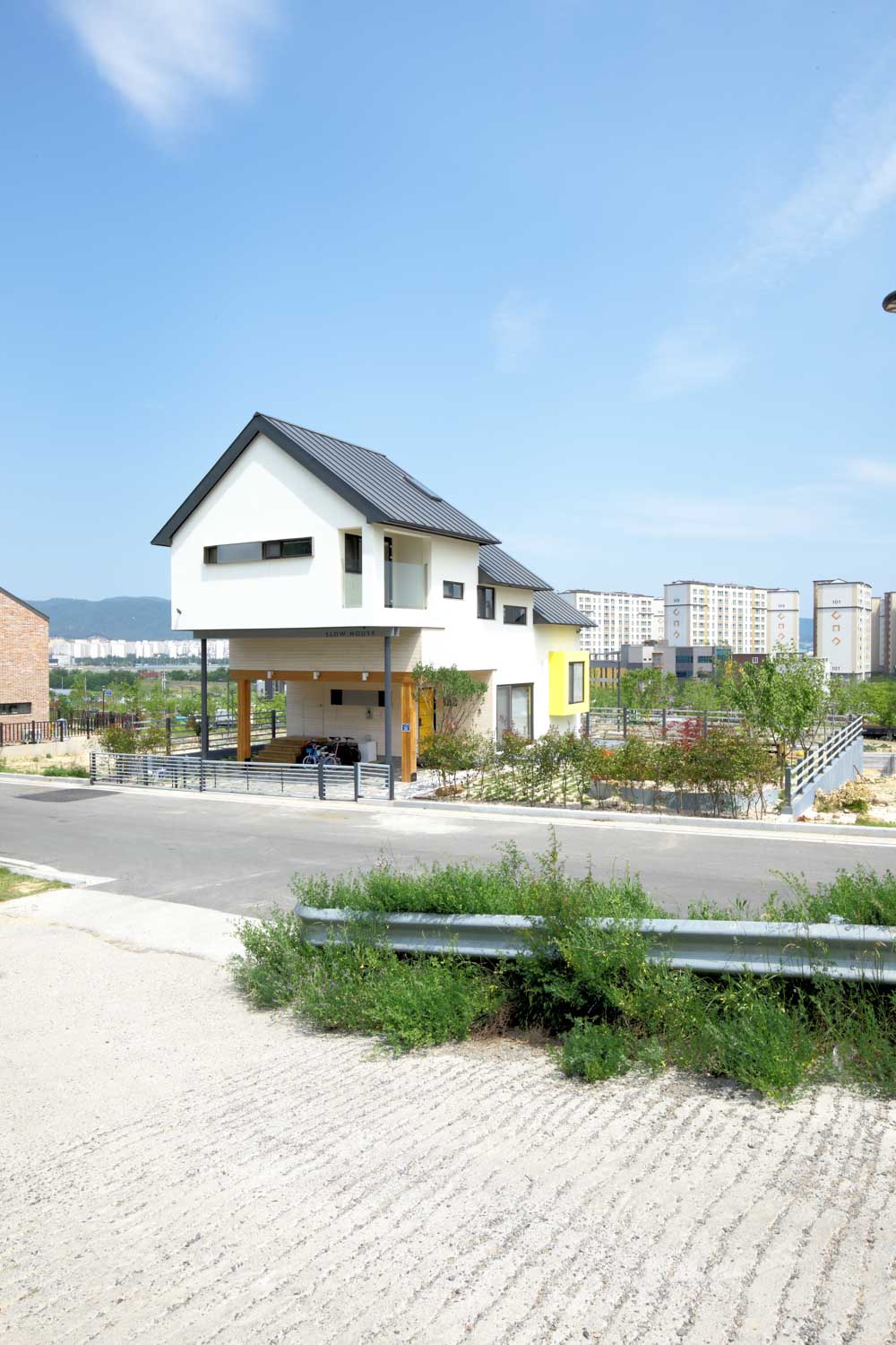 산등성이에 위치하여 바로 앞에 차가 많이 다니는 도로가 있기 때문에 도로에 면하는 1층은 필로티화 하여 1층 공간과 도로 사이에 거리를 두었으며, 필로티로 인해 높아진 2층은 프라이버시 보호가 잘 되는 공간으로 계획되었다.