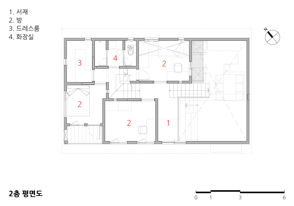 2층에서 반층을 올라가면 부부침실과 드레스룸 화장실이 있다. 실들은 같은 평면에 있고 하나의 큰다락 공간으로 읽히게 된다.