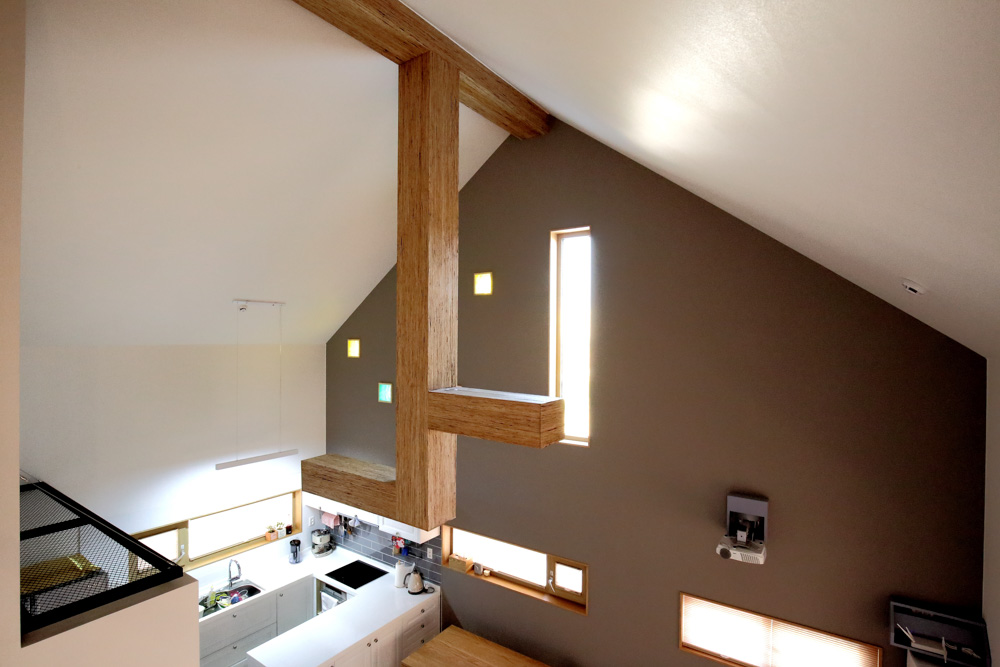 A house with three gable-shaped masses stacked looks small at a glance, but when you step inside and look at the living room connected from the first floor to the top, you don't think that way. You can feel a variety of spaces, including high spaces and narrow spaces created by overlapping masses.