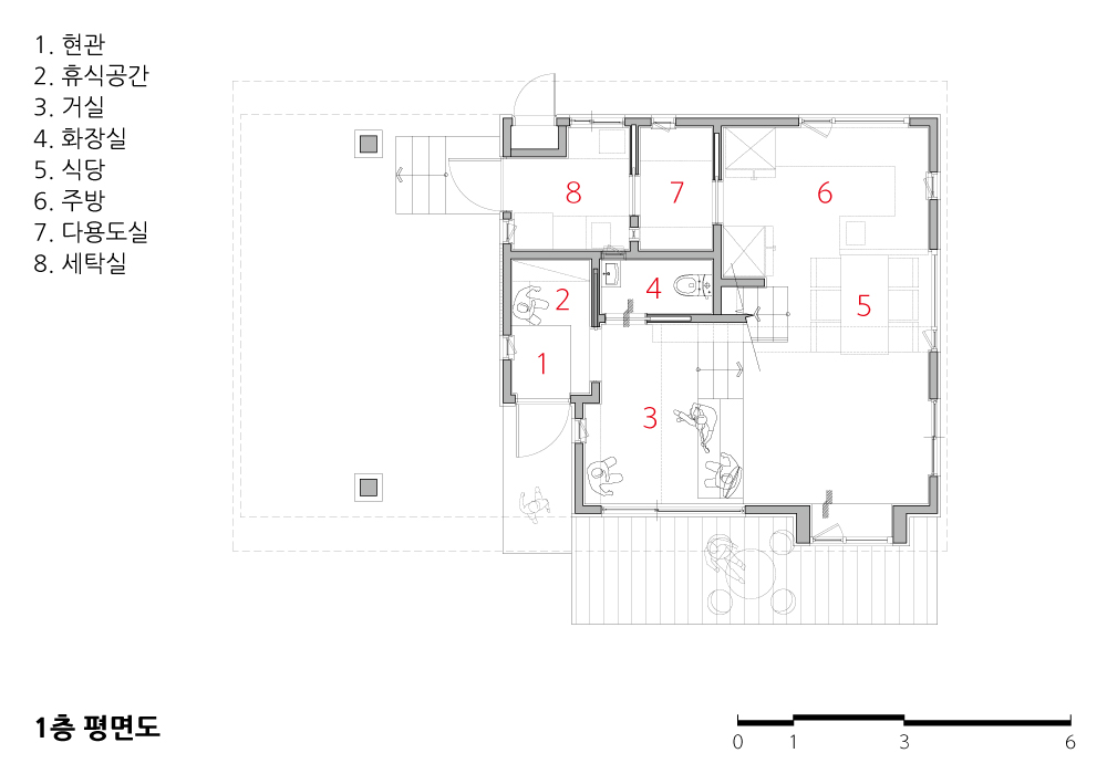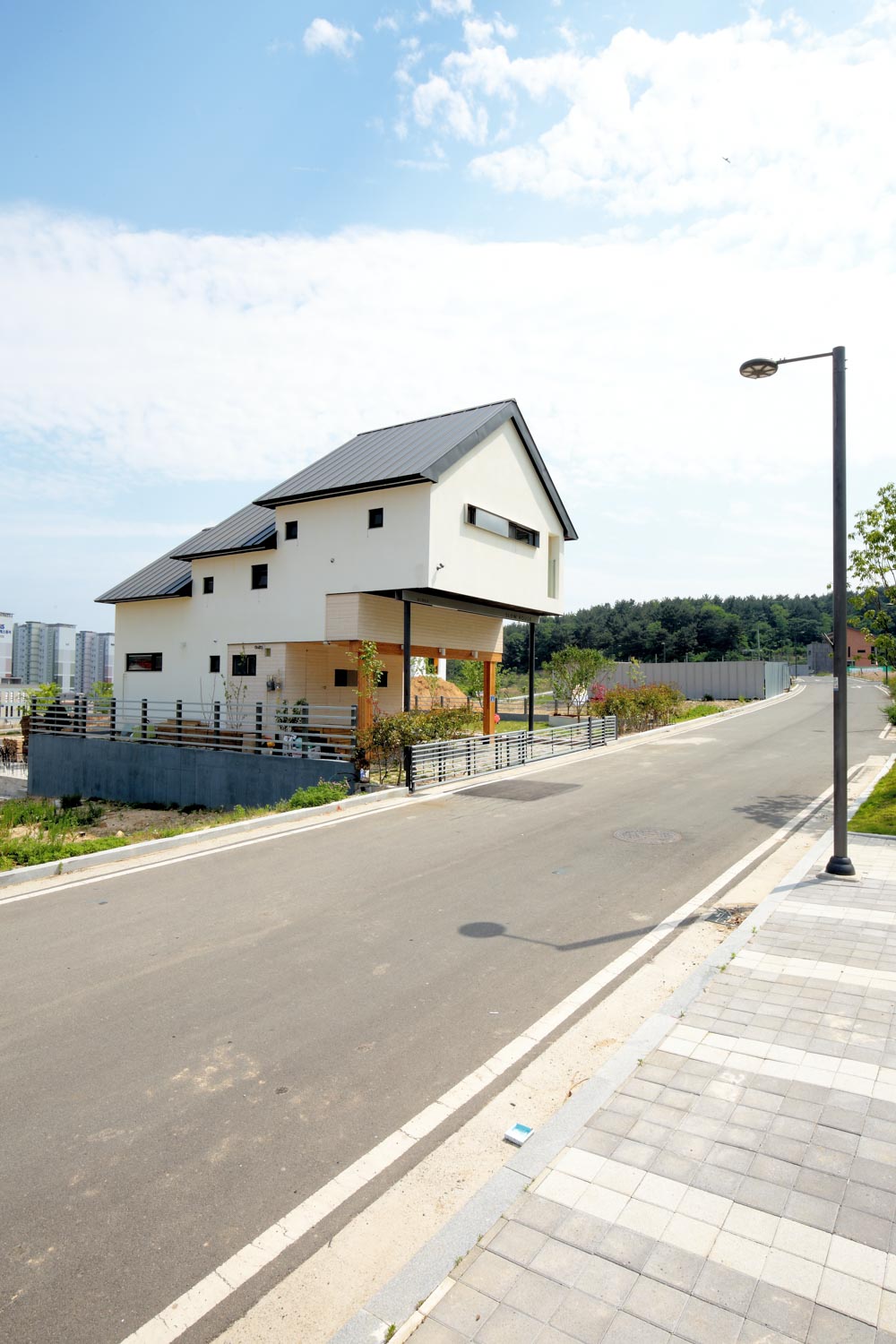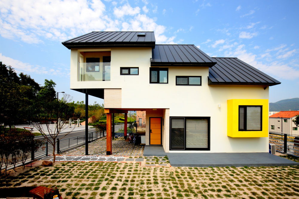 산등성이에 위치하여 바로 앞에 차가 많이 다니는 도로가 있기 때문에 도로에 면하는 1층은 필로티화 하여 1층 공간과 도로 사이에 거리를 두었으며, 필로티로 인해 높아진 2층은 프라이버시 보호가 잘 되는 공간으로 계획되었다.