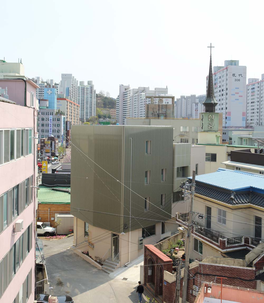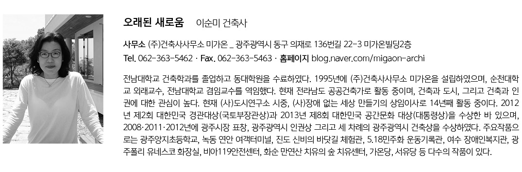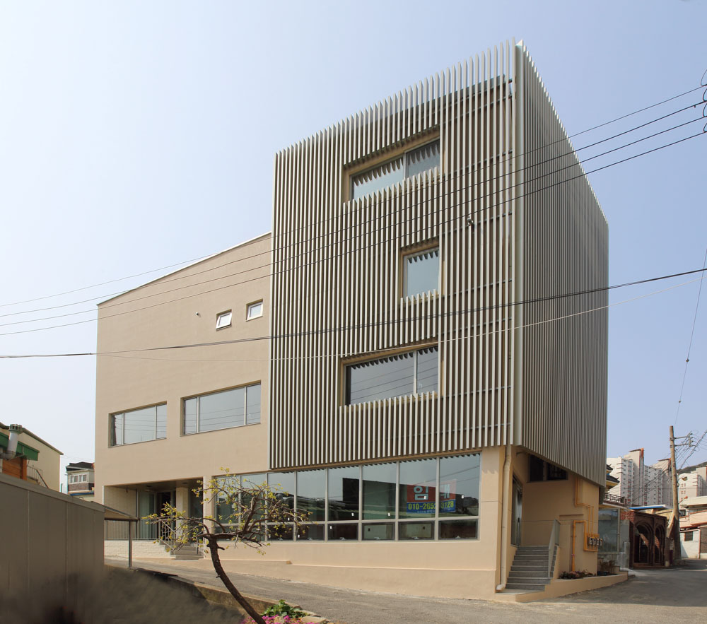 | 오래된 새로움(진월동 413-1 리모델링) 설계자 | 이순미 _ (주)건축사사무소 미가온 건축주 | 정조현 감리자 | 이순미 _ (주)건축사사무소 미가온 시공사 | 양동화 _ (주)인디디자인 설계팀 | 조가영, 임권욱, 이건욱 대지위치 | 광주광역시 남구 금당로5-1 주요용도 | 제2종근린생활시설(일반음식점, 학원), 단독주택 대지면적 | 226.00㎡ 건축면적 | 135.32㎡ 연면적 | 342.41㎡ 건폐율 | 59.87% 용적률 | 153.43% 규모 | 지상 4층 구조 | 철근콘크리트구조(기존) + 철골조(증축부분) 외부마감재 | A.L 루버, 치장 벽돌, 스타코 내부마감재 | V.P 도장 설계기간 | 2019. 09 ~ 2019. 11 공사기간 | 2019. 11 ~ 2020. 05 사진 | 조성진 |