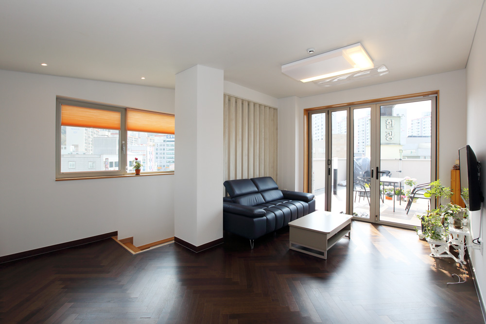 For the primary exterior material, we selected Starco, a relatively cheap exterior insulation system. This decision was made in consideration of economic efficiency while meeting the heat transmission coefficient for energy saving. Besides, it was designed to simplify the overall elevation by applying aluminum louvers. For the window essential for a comfortable living environment, we selected a triple glass system. A detached house with a loft is built on the 3rd and 4th floors, newly remodeled.