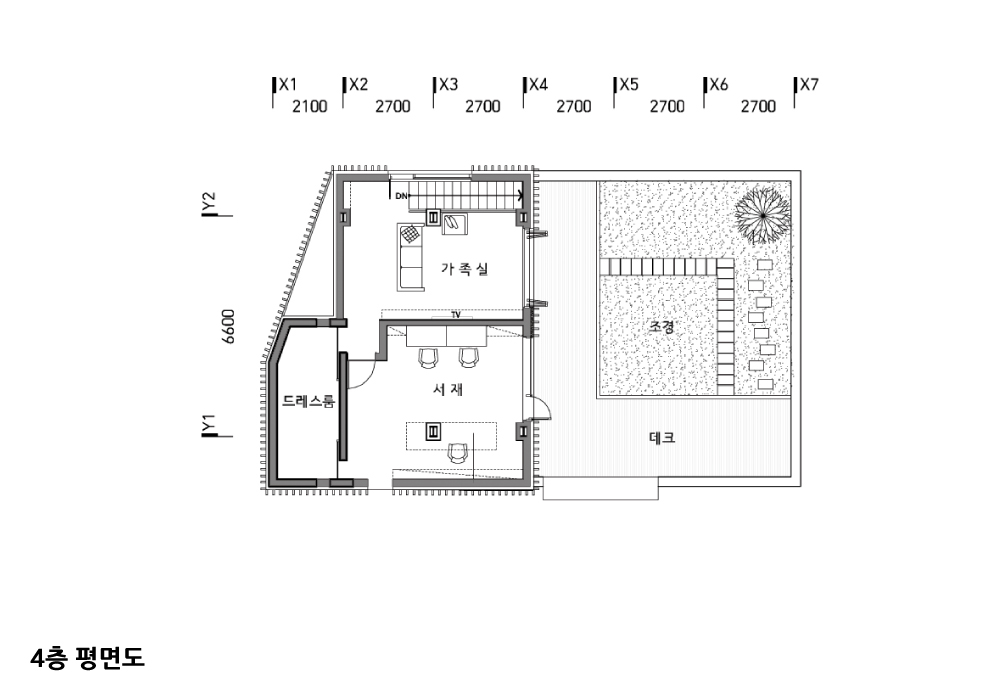 새롭게 리모델링되는 3층과 4층은 복층구조의 단독주택이다. 건축주가 가장 중점을 두었던 4층에는 남편의 근무 공간과 가족이 함께 할 수 있는 마당이 조성되었다. 이곳은 가족 및 지인들과 함께 바비큐 등을 할 수 있는 즐거운 나눔의 마당으로 활용될 것이다.