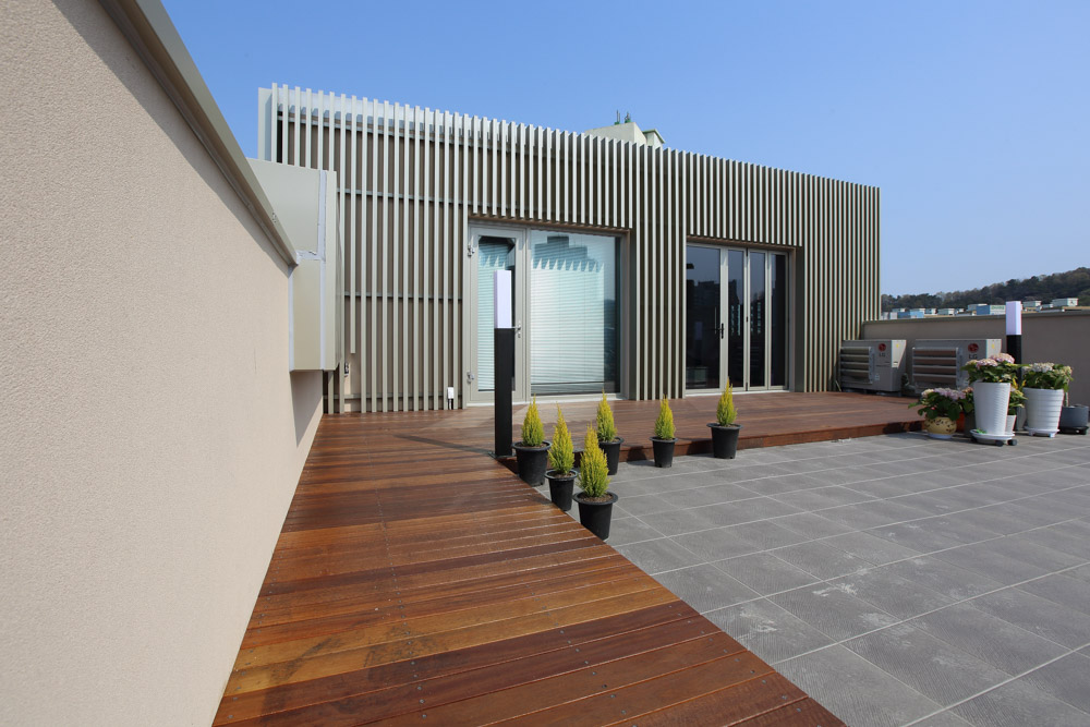 For the primary exterior material, we selected Starco, a relatively cheap exterior insulation system. This decision was made in consideration of economic efficiency while meeting the heat transmission coefficient for energy saving. Besides, it was designed to simplify the overall elevation by applying aluminum louvers. For the window essential for a comfortable living environment, we selected a triple glass system. A detached house with a loft is built on the 3rd and 4th floors, newly remodeled.