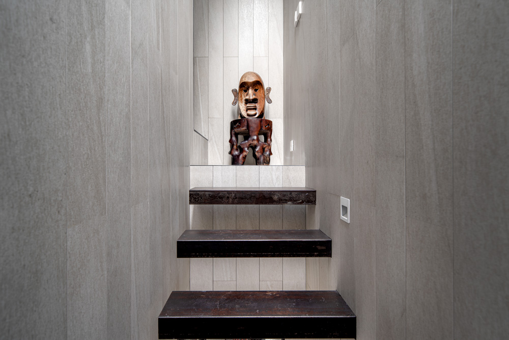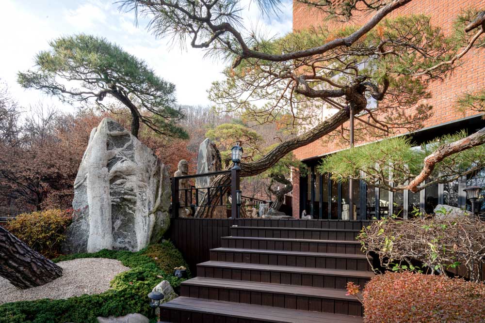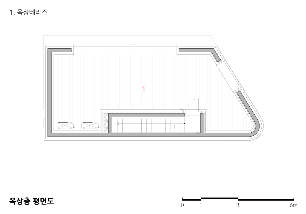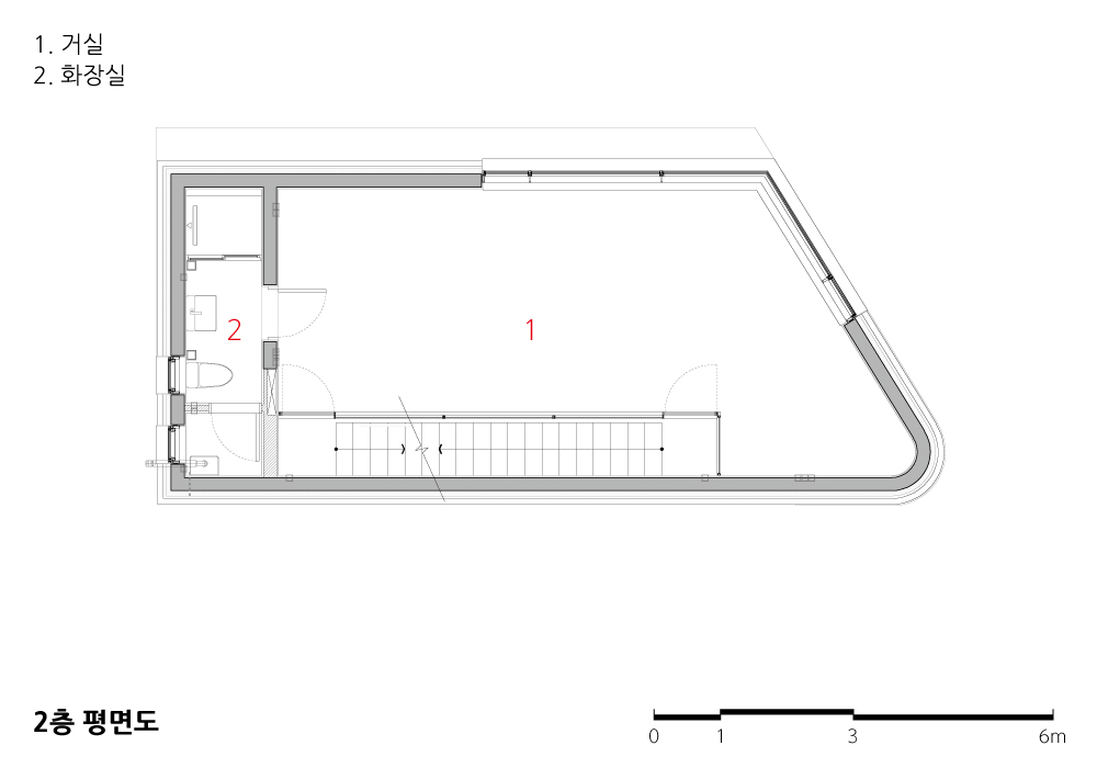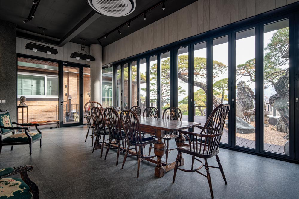 기존의 전체 대지가 유려한 산세를 배경으로 한 경사지에 위치하고 있고, 조망의 가치가 극대화된 곳이다. 따라서 내부 공간에서 그러한 뷰의 가치를 고양시키기 위해서 수직 동선을 배면으로 배치하였고, 개구부 또한 전면부로만 집중하여 동선상에 컨트라스트를 부여하여 설계하였다.