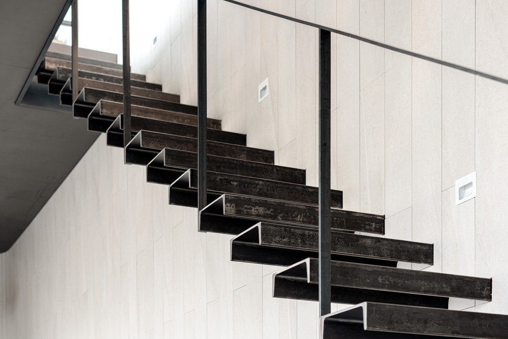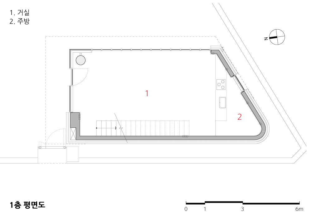 1층은 여러 사람들과 식사를 할 수 있는 거실로써 창호를 개방하면 전면의 넓은 데크 마당으로 내외부 공간이 혼합될 수 있도록 단차없는 연속성의 성격을 극대화할 수 있도록 계획하였다. 2층으로 가는 계단은 ‘ㄷ’형강을 캔틸레버로 구축하여 수직 동선의 긴장감을 부여하고자 하였다. 조경과 내부 인테리어 및 가구 집기도 건축주의 고유한 감성과 안목을 반영하여 구성하였다.