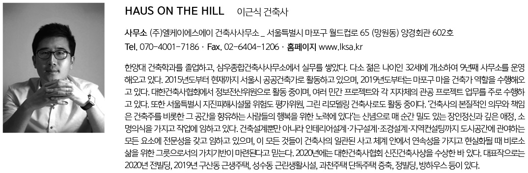 | HAUS ON THE HILL 설계자 | 이근식 _ (주)엘케이에스에이 건축사사무소 감리자 | 이근식 _ (주)엘케이에스에이 건축사사무소 시공사 | (주)떼오종합건설 설계팀 | 배춘근 대지위치 | 경기도 과천시 주요용도 | 단독주택 대지면적 | 669.00㎡ 건축면적 | 144.63㎡ 연면적 | 478.84㎡ 건폐율 | 21.62% 용적률 | 34.32% 규모 | 지하 1층, 지상 2층 구조 | 철근콘크리트구조 외부마감재 | 치장벽돌 내부마감재 | 화강석, 노출콘크리트 치장, 석고보드 위 페인트 설계기간 | 2018. 12 ~ 2019. 02 공사기간 | 2019. 05 ~ 2019. 12 사진 | 구의진 구조분야 : SDM구조 기계설비분야 : 하이텍엔지니어링 전기분야 : 하이텍엔지니어링 소방분야 : 하이텍엔지니어링 |