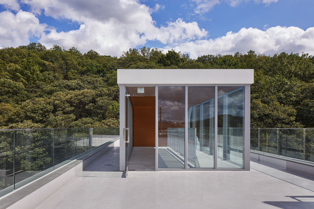 The left and right edges of the 38.1-meter long box face the riverside and the temperate forest with great views. We hoped that the spatial domain would be divided into light with a gradation of light and darkness in a long tunnel. As opposed to strong and rough, widespread, and tough panel exterior walls, the interior was designed to be white with exposed steel structure, while furnishing the interior with delicate and detailed metals such as roof structure and stairs all over from the first to the third floor. As if strength and softness coexist, we hoped that soft metals would lightly flow through space.