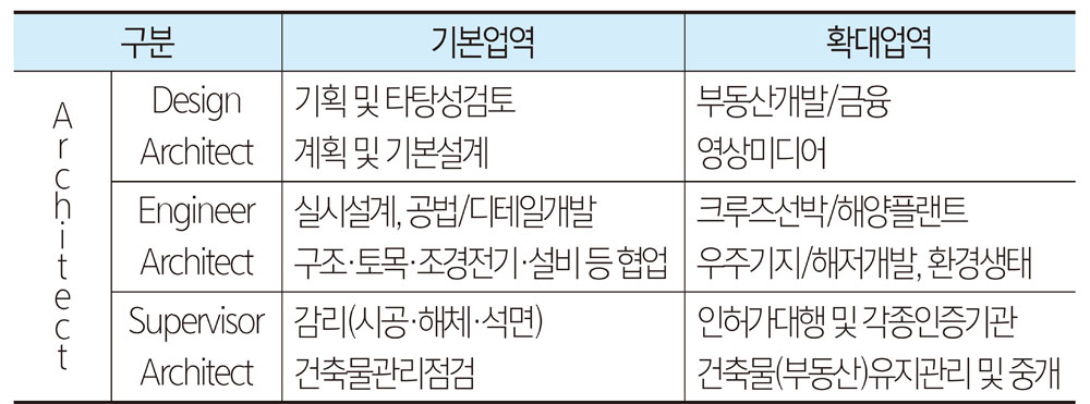 전문의처럼 전문건축사 제도는 없지만, 모든 것을 잘 할 수 있다는 생각을 버리고 자신의 능력에 맞는 전문적인 건축사 업역에 집중하여야 한다. 건축사 업역을 디자인 건축사와 엔지니어 건축사, 슈퍼바이져 건축사로 구분하고 각 분야별로 최적의 조직과 업무영역을 구성하여야 한다. 디자인 건축사는 기획, 계획설계를 기본으로 부동산개발과 영상미디어 등의 영역으로 확대하고, 엔지니어 건축사는 실시설계와 신공법, 디테일, 신자재를 개발하고, 구조·전기·기계설비 등을 포괄한 엔지니어 분야는 물론 해양플랜트, 우주기지건설까지 업역을 확대하여야 한다. 슈퍼바이저 건축사는 시공감리, 해체감리, 석면감리 등 감리와 에너지 및 BF 인증, 건축물관리점검, 시설물(부동산) 관리 등의 업무는 물론 건축인허가 민간대행업무까지 수행하여야 한다.