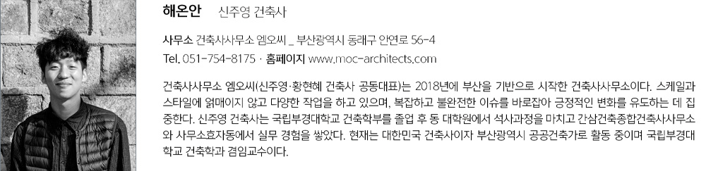 | 해온안 설계자 | 신주영, 황현혜_건축사사무소 엠오씨 시공사 | 라이프이즈로맨스 대지위치 | 경상북도 영덕군 병곡면 병곡1길 25 주요용도 | 단독주택 대지면적 | 1,283.00㎡ 건축면적 | 144.82㎡ 연면적 | 144.82㎡ 건폐율 | 11.29% 용적률 | 11.29% 규모 | 지상 1층 구조 | 철근콘크리트조 외부마감재 | 콘크리트벽돌타일(두라스텍), 노출콘크리트미장 내부마감재 | 도장, 마루 설계기간 | 2019. 04 ~ 2019. 10 공사기간 | 2019. 10 ~ 2020. 05 사진 | 텍스처 온 텍스처 구조분야 : 은구조 기계설비분야 : 제이에스이엔지 전기분야 : (주)도시이엔지 인테리어 및 조경 : 라이프이즈로맨스 |