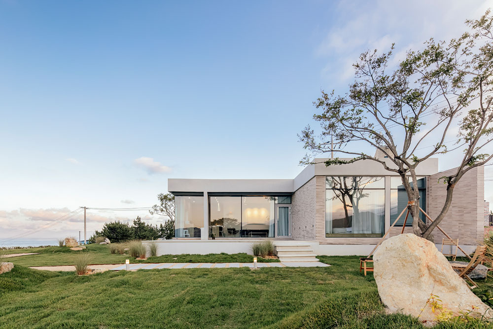 내부로 들어가면 거실 너머로 정원과 해안선이 펼쳐져 있어 작은 채의 평면적인 풍경과는 사뭇 다르게 느껴진다. 거실의 바닥을 바깥의 기단으로 연장했고 이를 외벽으로 감싸 안아 풍경에 깊이감을 더했다.