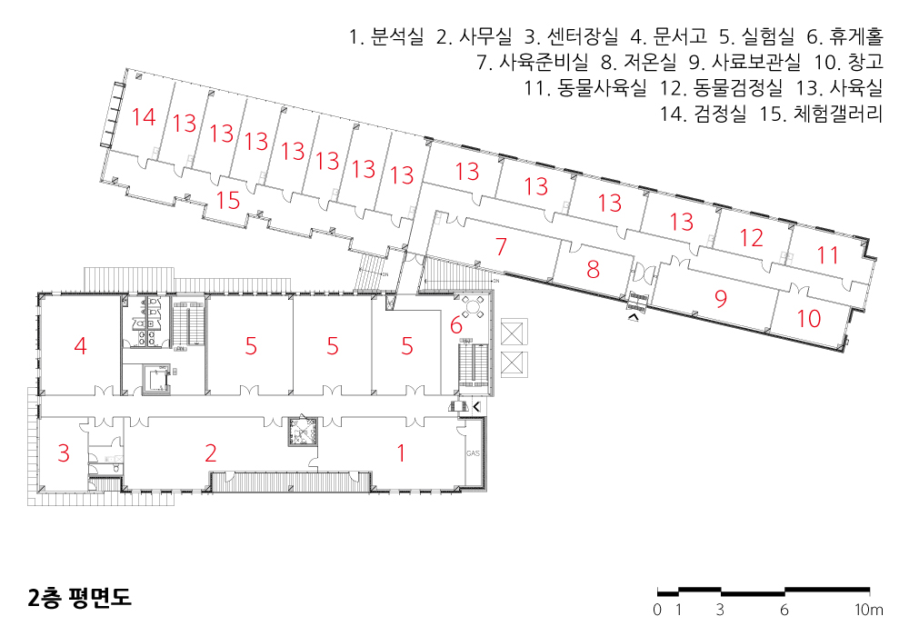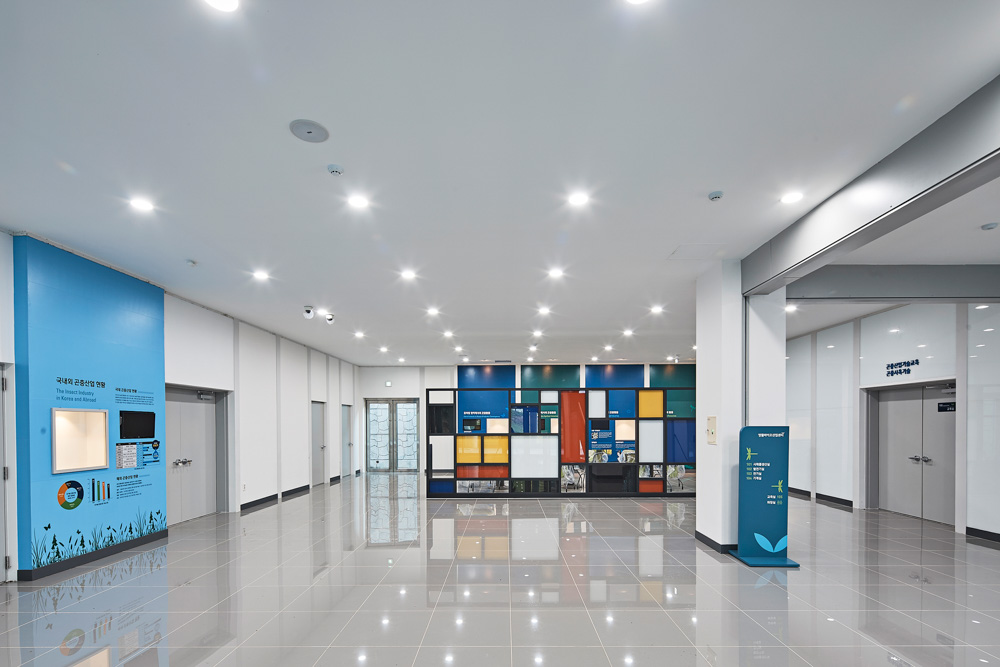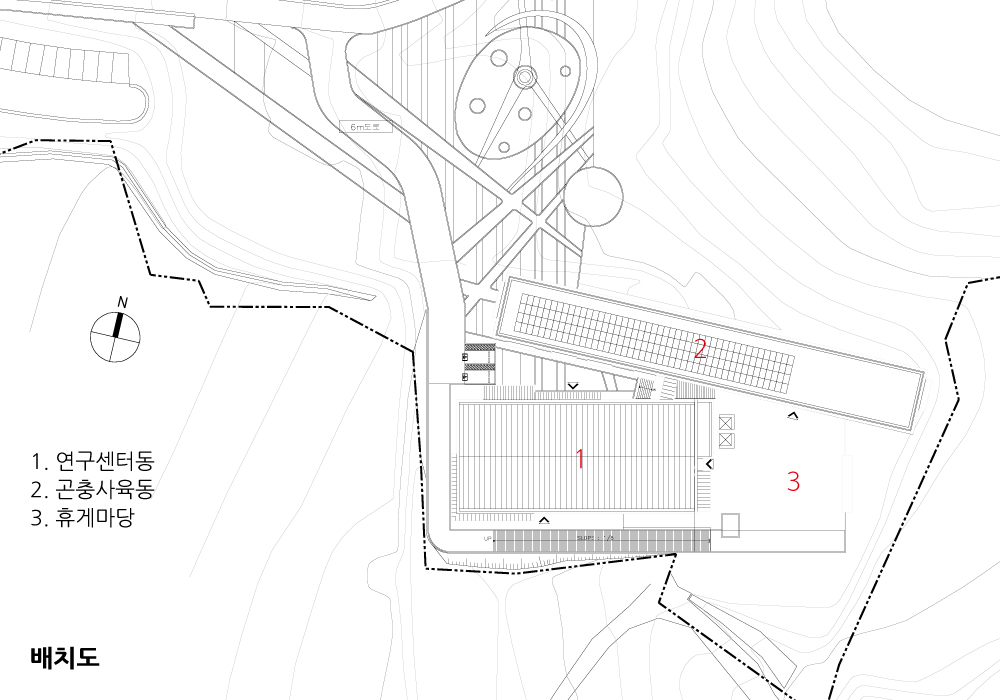 연구자의 동선과 곤충의 사육조건은 동서로 기다란 매스를 만들었다. 투명한 재료와 불규칙한 루버, 사선 창호의 적용은 선형매스의 지루함을 다이나믹하게 변형한다.