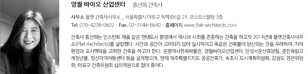 | 영월 바이오 산업센터 설계자 | 홍선희_플랫 건축사사무소 건축주 | 영월군 감리자 | (주)하나 건축사사무소 시공사 | 주식회사 우일 설계팀 | 손종혁, 정상주, 오병윤 대지위치 | 강원도 영월군 영월읍 삼옥리 258번지 동강생태공원 주요용도 | 교육연구시설(연구소), 동식물관련시설 대지면적 | 170,042㎡ 건축면적 | 1,594.81㎡ 연면적 | 2,543.00㎡ 건폐율 | 3.88% 용적률 | 4.84% 규모 | 지상 2층 구조 | 철근콘크리트구조, 철골구조 외부마감재 | 금속판넬, 투명단열판넬, 점토벽돌 내부마감재 | 화강석, 전도성비닐타일, SGP, 흡음텍스 설계기간 | 2016. 02 - 2016. 10 공사기간 | 2017. 03 - 2019. 03 사진 | 이남선 구조분야 : 시너지엔지니어링 기계설비분야 : 태림이엔씨 전기분야 : 에스비이엔씨 소방분야 : 대안엔지니어링 |