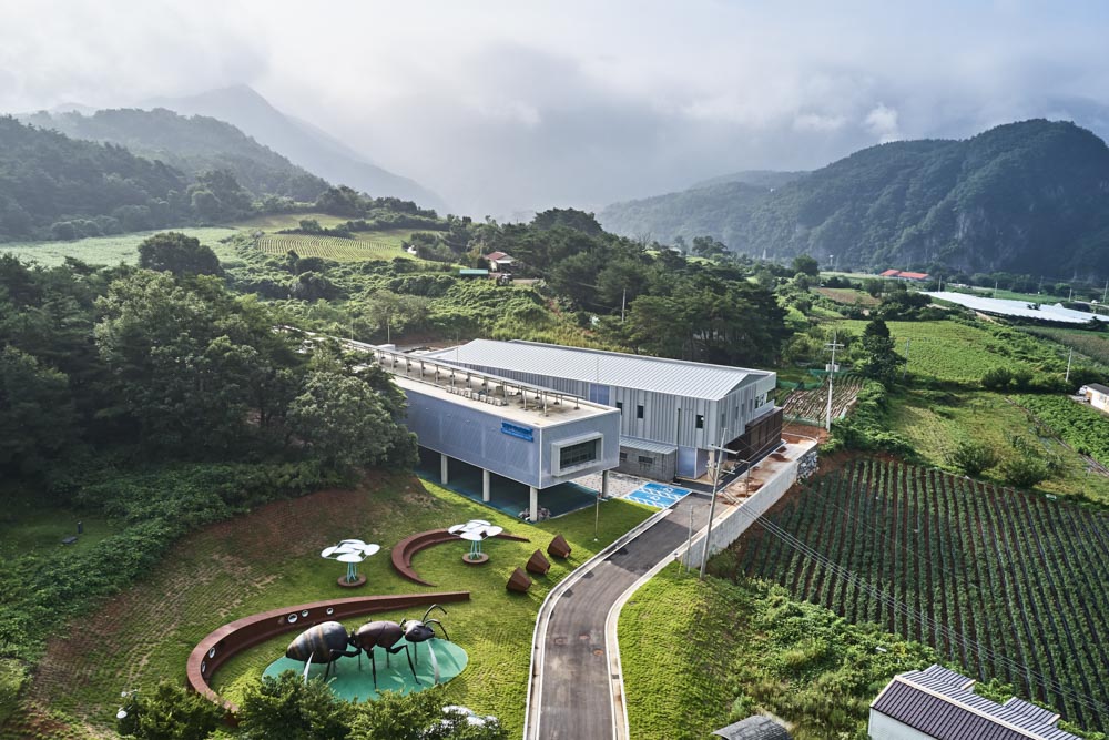Yeongwol Bio Industry Center is a security facility located in a public park. The boundary with the public was divided using the topography of the site. The 5-meter sloped site naturally provides a front yard and a middle yard for the public, and a private research space is protected along with the back yard.