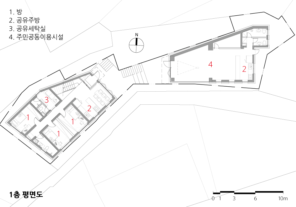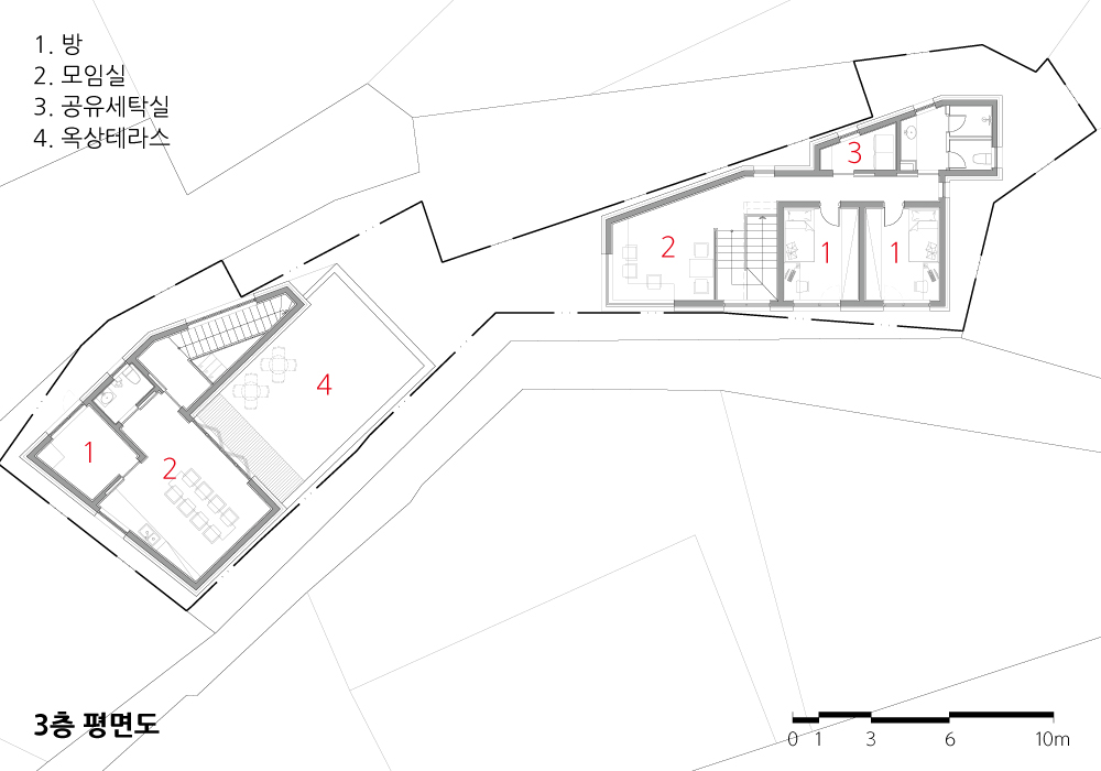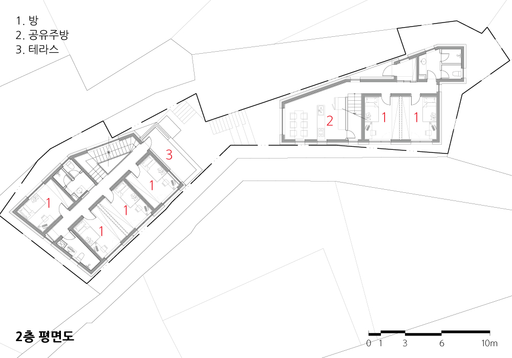 그리고 골목길 소통문화도 유지하고 싶었다. 대상지는 차량이 진입할 수 없고 계단이나 보행으로만 접근 가능한 대지이다. 골목길을 걸으면서 우연한 만남이 이뤄지고, 인사를 하고 안부를 물으며 서로의 일상을 얘기할 수 있는 공간을 만들고자 했다. 실내의 방들은 개별적으로 독립된 공간이지만 공유식당, 모임공간, 창업·취미공간, 커뮤니티 계단 등은 거주자들끼리 소소하게 소통할 수 있는 공간이 될 것이다.