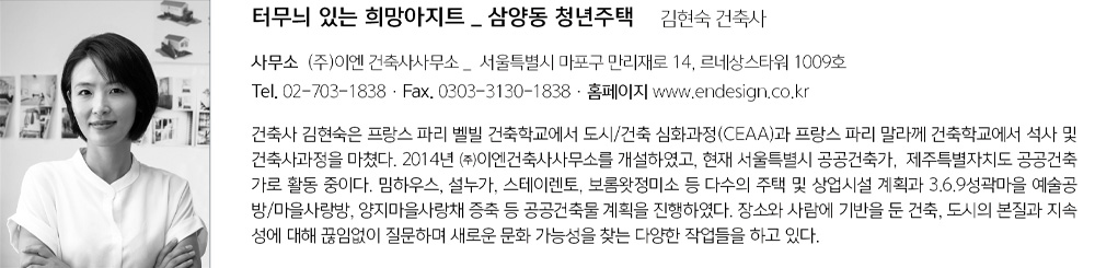 | 터무늬 있는 희망아지트 _ 삼양동 청년주택 설계자 | 김현숙 _ (주)이엔건축사사무소 건축주 | 서울주택도시공사 감리자 | 김현숙 _ (주)이엔건축사사무소 시공사 | 라움종합건설주식회사 설계팀 | 박지은, 강수정 대지위치 | 서울특별시 강북구 솔매로 3-8, 3-10 주요용도 | 공공임대주택, 주민공동이용시설 대지면적 | 278.04㎡ 건축면적 | 166.64㎡ 연면적 | 373.22㎡ 건폐율 | 59.93% 용적률 | 134.23% 규모 | 2개 동, 지상 3층 구조 | 철근콘크리트구조 외부마감재 | 매가패널(화이트 그레이), 포세린타일(유니퍼 Super white) 내부마감재 | 강화온돌마루재, 석고보드 위 벽지, 목재 흡음판 설계기간 | 2019. 01 - 2019. 07 공사기간 | 2019. 10 - 2020. 10 사진 | 이한울 구조분야 : 중앙구조기술사사무소 기계설비분야 : 세원엔지니어링(주) 전기분야 : (주)정연엔지니어링 소방분야 : 세원엔지니어링(주) |