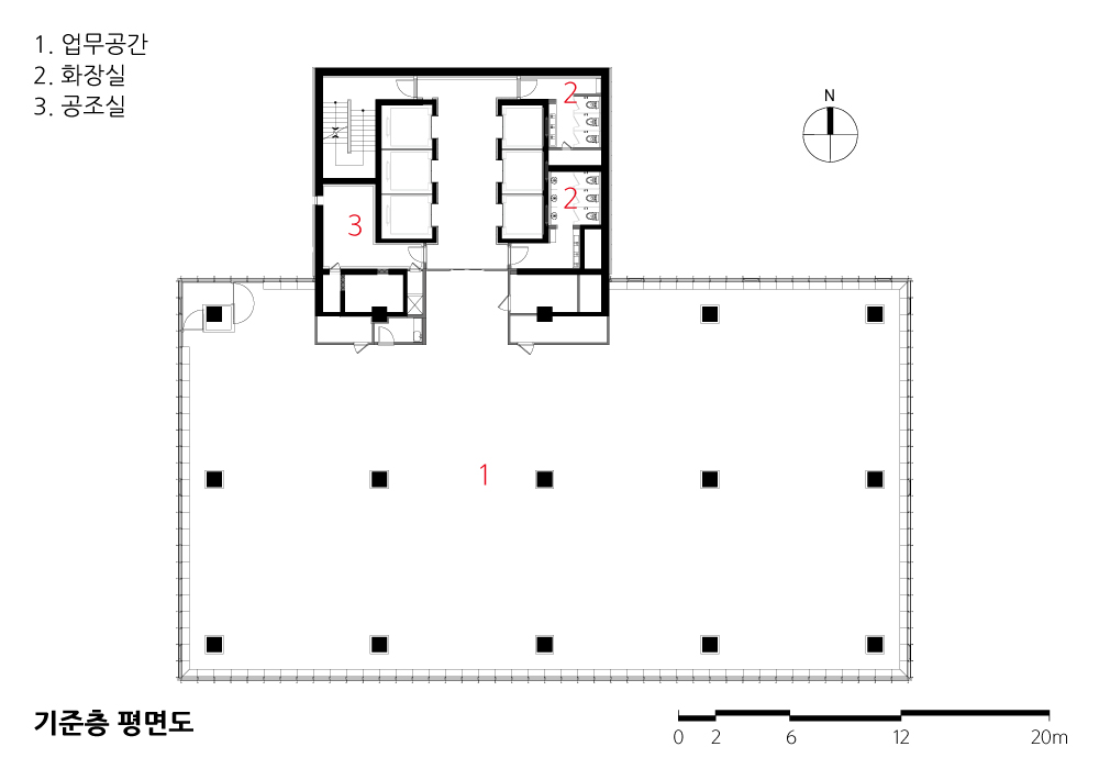 Unlike the Seagram Building, the core of the 31 Building is an independent core, rectangular space consisting of 15 columns and 8 square grids at intervals of 9 meters. It has a universal design that is completely separated from the office area. In core planning, which is the core of the office, the office pantry and facility space were protruding into the office space during the remodeling process that took place once in 1980. We restored the shape of these planes while simultaneously placing the increased facility space as needed into a compact square frame of the core, increasing the insufficient toilet area and improving the lift's performance.