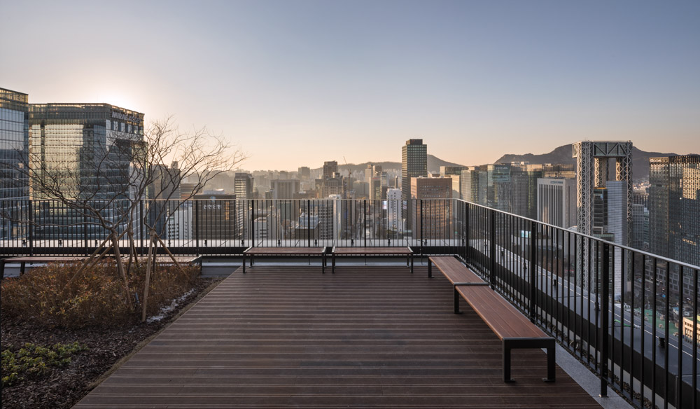 The rooftop needed some rooftop structures due to additional facilities, requiring a protruding structure that the existing building didn't have. The basic principle is to design by linking the existing core and mass as much as possible and setting them back from the outer wall finish to maintain the current prototype as much as possible. The material finish is planned as an aluminum louvers by taking design elements of the typical floor's vertical mullions.
