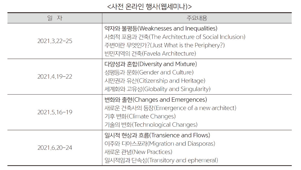 먼저 7월 18일에는 개막식(현지 기준, 17시)에 이어 리셉션과 소셜 네트워킹 행사가 생중계된다. 19일부 터 21일에는 9시부터 19시까지 온라인콘텐츠 및 토론, 강의가 생중계된다. 기조연설은 세계 각국에서 ▲ 카를라 주아카바(Carla Juaçaba, Brazil) ▲디예베도 프란시스 케헤(Diébédo Francis Kéré, Burkina Faso) ▲에두아르두 소투 드 모라(Eduardo Souto de Moura, Portugal) ▲엘리자베스 드 포잠박 (Elizabeth de Portzamparc, France) ▲파울루 멘데스 다 로샤(Paulo Mendes da Rocha, Brazil) ▲솔라노 베니테스(Solano Benitez, Paraguay) ▲스테파노 보에리(Stefano Boeri, Italy) ▲타티아노 빌바오(Tatiana Bilbao, Mexico) 등 총 8명이 연사로 나선다.