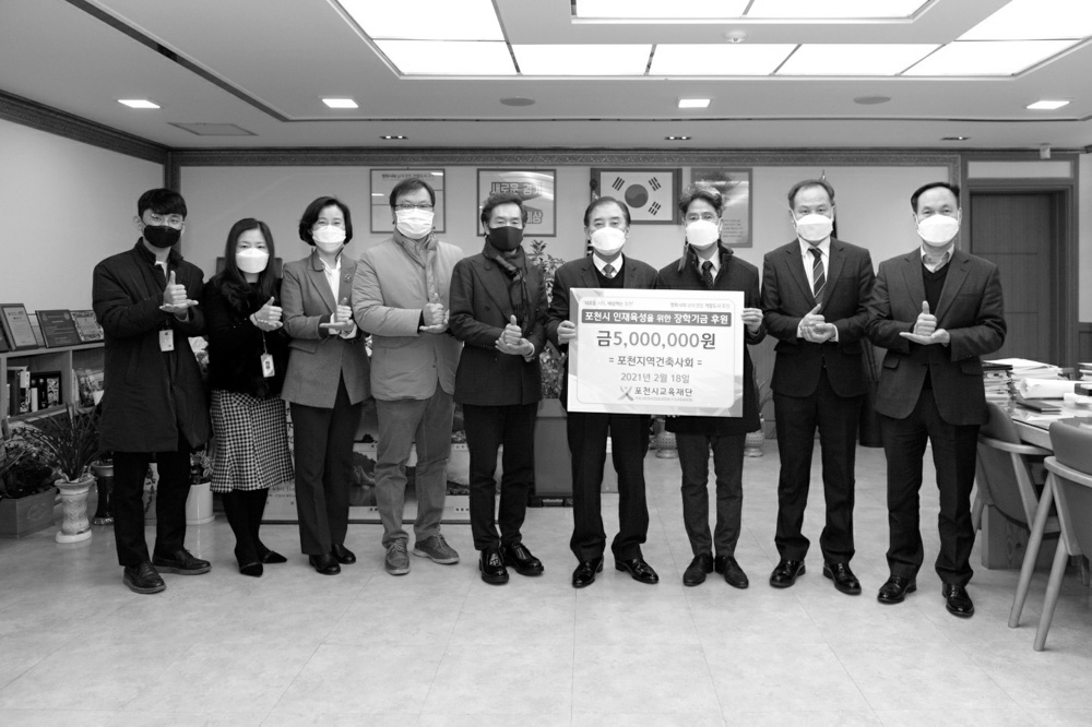 경기도건축사회 포천지역건축사회는 2월 18일 포천시교육재단에 장학기금 500만 원을 전달했다. 포천지 역건축사회가 기탁한 장학금은 지역 우수인재 육성을 위한 용도로 활용된다.