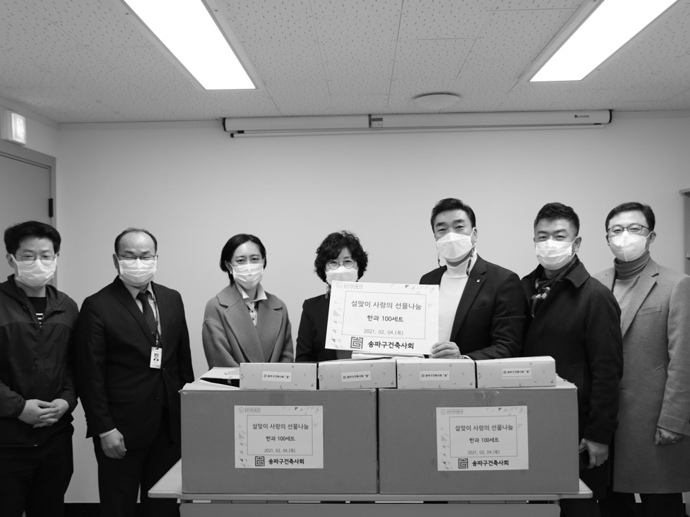 서울특별시건축사회 송파구지역건축사회는 지난 2월 4일 설날을 맞아 송파구방이복지관에 회원들의 마음 을 담은 한과세트 전달 행사를 가졌다. 이날 전달된 한과는 모두 100세트로, 예년에는 직접 복지관을 찾아 선물을 전달했지만 올해 행사는 코로나19 상황으로 대면 행사 진행이 불가능해 비대면으로 진행됐다. 전달 된 한과세트는 코로나19로 어려움을 겪고 있는 지체장애인 100가구에 전달될 예정이다.