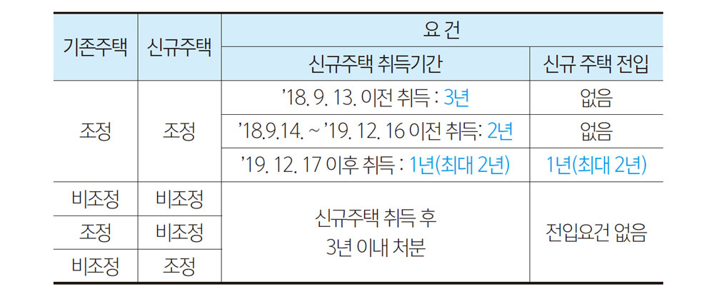 2019년 12월 16일 부동산 대책으로 인하여 B주택을 ’19년 12월 17일 이후 취득하였다면 종전 A주택을 1년 내 처분하여야 비과세가 가능하며, 1년 이내에 B주택에 전입을 하여야 한다. 만약 B주택을 취득할 당시 기존 임차인이 있었다면 A주택의 처분기한 및 B주택에 전입의무기간을 임대차계약 종료 시까지 연장(최대 2년)하여 전입을 하여야 하고, 신규 취득일 이후 갱신한 임대차 계약은 인정하지 않는다(A주택 및 B주택이 조정대상지역의 주택일 경우에 한함). 예외적으로 ’19년 12월 16일 전 매매계약을 체결하고 계약금을 지불한 경우는 2년 규정을 적용한다.
