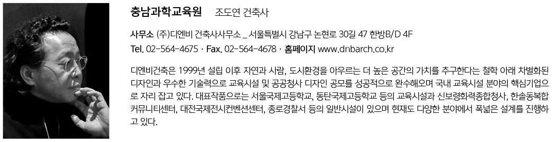 | 충남과학교육원 설계자 | 조도연_(주)디엔비건축사사무소 건축주 | 충청남도교육청 교육감 감리자 | 선엔지니어링 종합건축사사무소 시공사 | 금동종합건설(주) 설계팀 | 임정훈, 한고은, 김현태 대지위치 | 충청남도 아산시 순천향로 624-30 주요용도 | 교육연구시설 대지면적 | 42,263.00㎡ 건축면적 | 6,826.20㎡ 연면적 | 14,526.28㎡ 건폐율 | 17.95% 용적률 | 33.72% 규모 | 지하 1층 - 지상 3층 구조 | 철근콘크리트조, 철골조 외부마감재 | T3 AL SHEET, T0.6 접합제진강판 내부마감재 | 인테리어마감, 노출콘크리트 면처리, 친환경 수성페인트 설계기간 | 2016. 01 - 2017. 03 공사기간 | 2017. 05 - 2019. 10 사진 | 채수옥 전문기술협력 - 구조분야 : (주)동양구조엔지니어링 - 기계설비분야 : 하나설비엔지니어링 - 전기분야 : (주)유일엔지니어링 - 소방분야 : (주)유일엔지니어링 |