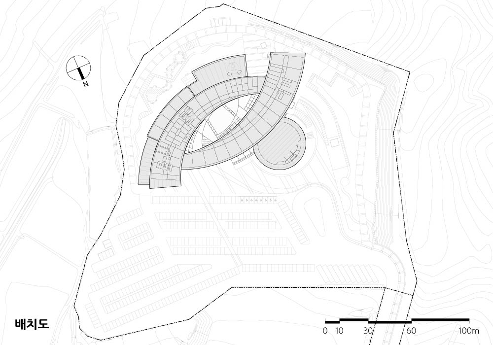 메인도로를 통해 진입하면 평지에서 산으로 자연스럽게 올라가는 대지의 모습이 사업부지를 둘러싸고 있다. 그러한 대지의 흐름을 모티브로 입체적인 공간의 흐름을 만들었으며, 프로그램의 특성을 고려하여 두 개의 매스를 과학교육존과 업무·관리존으로 명확히 구성하였다.