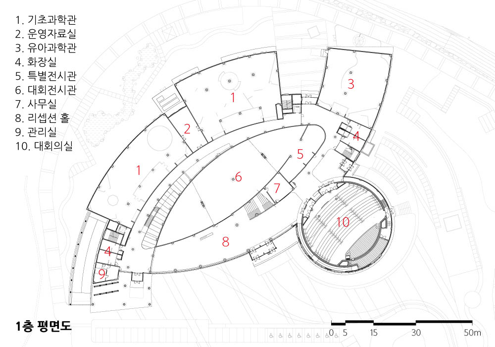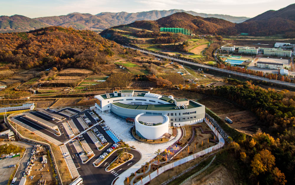When you enter through the main road, the site that naturally rises from the flatland to the mountain surrounds the project site. Using the flow of the land as a motif, a three-dimensional spatial was created. The two masses were clearly constructed into a science education zone and a work/management zone in view of the program's characteristics.