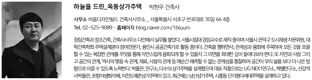 A sunny house facing the sky _ Okdong Commercial House Architect | Park, Hyunwoo _ Biuum designbuild + Dain Architects Group Client | Kim, Sangyoon Supervisor | Joon architecture corporate Construction | Barun Construction Co., Ltd. Location | 347, Gyeongbuk-daero, Andong-si, Gyeongsangbuk-do, Korea Program | Housing + Neighborhood living facilities Site area | 300.50㎡ Building area | 171.27㎡ Gross floor area | 494.58㎡ Building to land ratio | 56.99% Floor area ratio | 164.59% Building scope | 4F Structure | RC Exterior finishing | Wood louver, Steel plate coating Interior finishing | Ceiling-silk wallpaper + eco-friendly paint coating Wall- silk wallpaper + Waynes coating Floor-Gujeong reinforced floor Design period | Apr. 2017 - Sep. 2017 Construction period | Oct. 2017 - May 2018 Photograph | Kim, Yongsoon |
