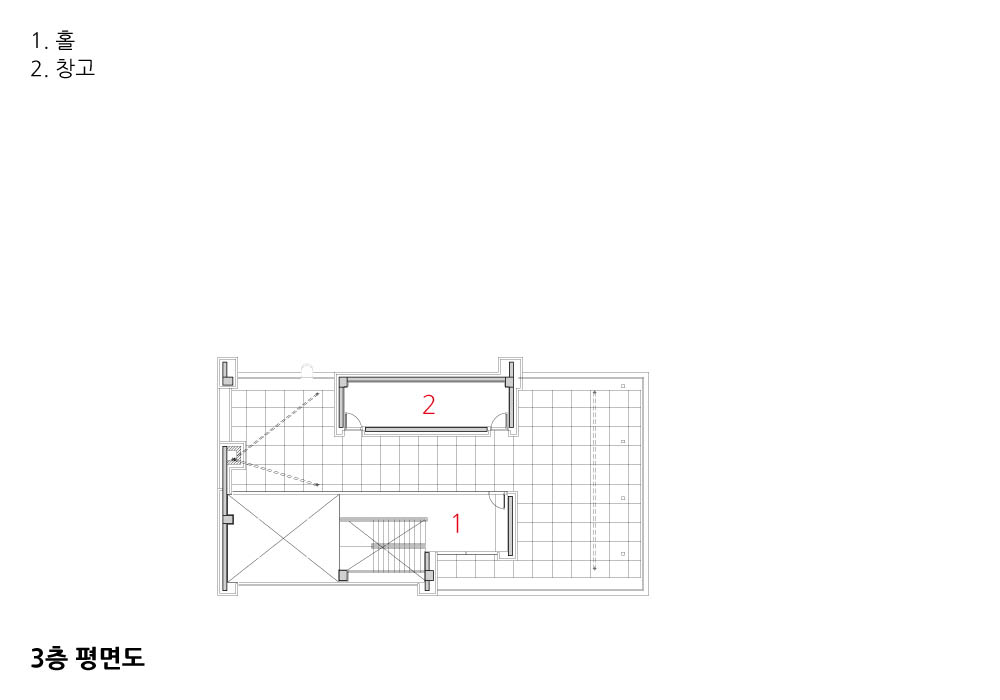 대지의 입지 조건상 건물의 전면은 북측인 대로변을 향할 수밖에 없었다. 상업건물의 인지성을 감안하여 북측으로 최대한 개방된 입면을 제안하고, 1층은 카페 홀 및 주방 등 서비스를 위한 주 진입 공간으로 구성하였다. 2층 실내 및 3층 외부 테라스는 사용자가 주로 머무를 수 있는 공간으로 의도되었다. 1층 실내부터 3층의 외부공간까지 사용자의 동선에 따라 시선이 향하는 공간에는 외벽의 벽돌을 엇갈리게 쌓았다. 이는 실내로 빛을 받아들이는 방식에 변화를 두어 수평적 공간의 깊이감을 더하는 장치로 활용되었다. 계단을 끼고 높은 천장고와 함께 형성된 수직적 공간은 2층의 넓은 카페공간과 3층의 테라스 공간을 경험적, 그리고 시각적으로 중첩시켜주는 역할을 한다. 3층의 테라스 공간은 계단을 중심으로 크게 두 공간으로 나뉘는데, 이는 대지의 남측과 서측의 상대적으로 낮은 건물들로 구성된 주변 환경을 고려하여 열린 공간으로 제안되었다.