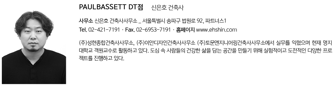 | PAULBASSETT DT점 설계자 | 신은호 _ 신은호 건축사사무소 건축주 | 김태준 감리자 | 신은호 _ 신은호 건축사사무소 시공사 | 주식회사 건우 설계팀 | 이두형, 박유정, 차종헌, 이태상 대지위치 | 전라북도 전주시 덕진구 기린대로 411 주요용도 | 제2종근린생활시설(일반음식점) 대지면적 | 1,707.50㎡ 건축면적 | 249.26㎡ 연면적 | 498.28㎡ 건폐율 | 14.59% 용적률 | 29.18% 규모 | 지상 3층 구조 | 철근콘크리트조 외부마감재 | 백고 벽돌, 커튼월 내부마감재 | 석고보드, 친환경수성페인트, 포세린타일 설계기간 | 2020. 05 - 2020. 07 공사기간 | 2020. 08 - 2020. 11 사진 | 남상인 구조분야 : 델타구조 기계설비분야 : (주)도담설계사무소 전기분야 : (주)도담설계사무소 소방분야 : (주)도담설계사무소 |