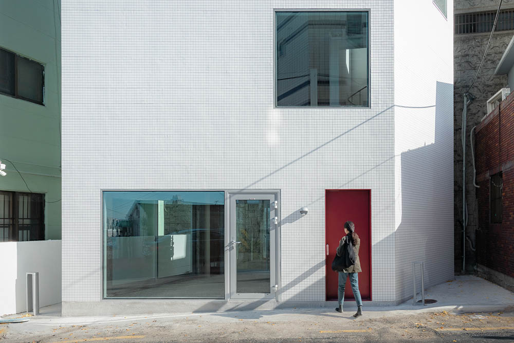 같은 면에 맞춰 마감된 타일과 유리는 건물의 단순한 형태를 더욱 완전하게 보이게 하고, 자투리 없이 딱 맞아떨어지는 타일 마감에서 작지만 완성도 높은 건물을 위한 시공자의 노고가 느껴진다.