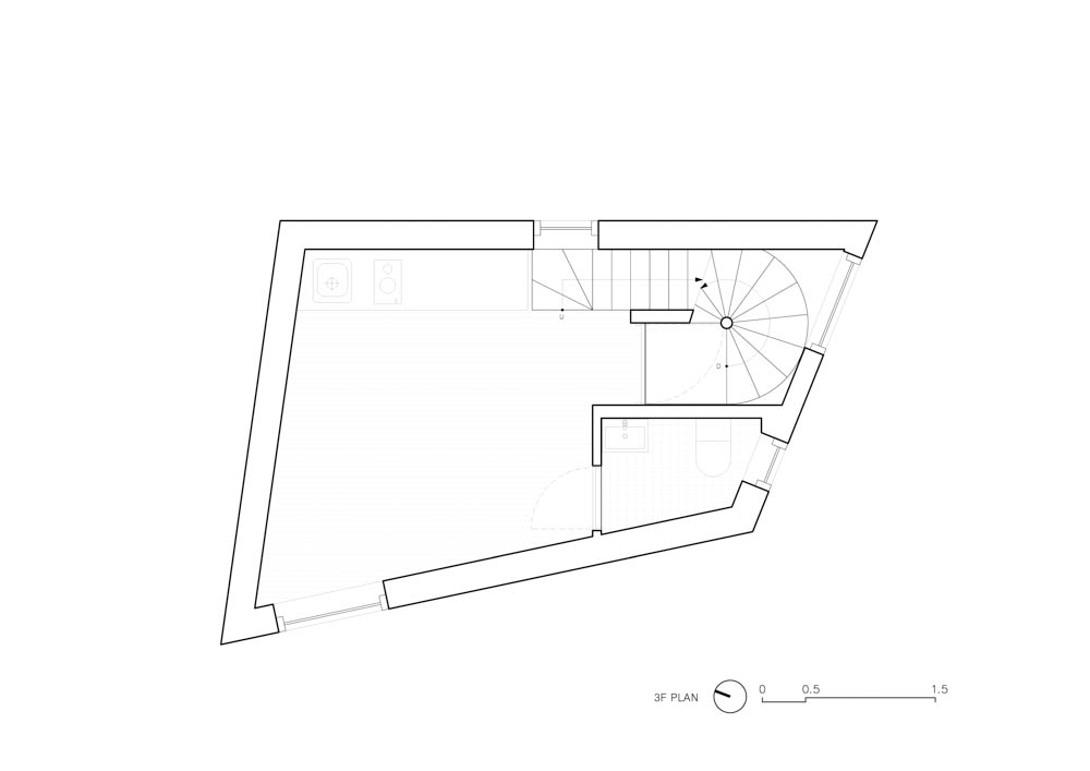 The 3rd and 4th floors are duplex studios. The third floor, which is the main living space, has a window at the corner of the building, avoiding a neighboring building that faces the building so that the user can see the sunset in the sky and the city's view. The daylight regulation made the 4th-floor area small and allowed the level to have a passageway to the rooftop terrace and a bedroom.
