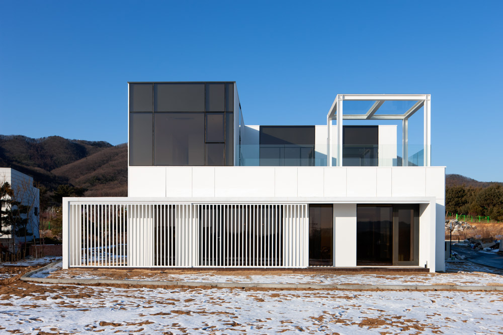 대지는 용인 처인구 사암리의 주택단지 내에 위치한다. 대한민국의 내로라하는 건축사들의 작품이 즐비한 단지 내에서도 이 집은 그리 빛을 잃지 않는다. 전통 건축에서 흔히 볼 수 있는 디귿자(ㄷ)형 배치는 주변의 나지막한 산세, 구릉지와 더불어 안성맞춤이다. 남향의 전면에 수직 이동 스크린 장치를 결합한 거실과 식당을 구성하고, 후면인 북쪽에 주출입구를 배치한 것은 조용하고 프라이버시를 원했던 건축주의 요구에 부응하면서 다소곳한 대지의 요구에 호응하는 좋은 선택이다. 잘 채우는 것과 더불어 잘 비우길 원했던 우리 조상들의 귀한 가르침은 이곳에서도 그대로 이루어진다. ㄷ자형 건축의 가운데(중심)에 위치하는 것은 ‘비움’의 마당이다. 이곳으로 인해 빛이, 바람이, 비가 자연스럽게 이 집을 찾아온다. ‘채움’에서는 잃어버리거나 잊어버린 가치의 회복이다. 작은 숨결 같은 바람에서 주변의 자연 산세로 이어지고 가히 우주의 기운으로까지 확장되는 무의 공간의 성공적인 현대적 재현이다. 채움과 비움과 채움이라는 ㄷ자형 구성의 전개가 갖는 진정한 힘은 이곳에서 다시 대타자(대우주, 무, 조물주, 신 등)의 세계로 나아갈 수 있는 가능성에 있기 때문이다.