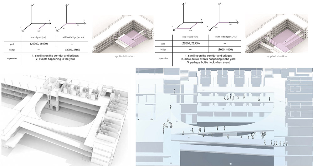 첫째, 사용자의 심리, 사회적 속성과 설계안의 수치적 변수 사이의 관계 실험이 디자인 프로세스에 포함되며, 건축물의 사용 편의를 위하여 사용자와 설계안의 변수 사이에 최적인 관계를 탐구하는 과정이 이루어진다. 예를 들어, 한 학생은 증개축 설계 프로젝트에서 유지건물과 증축건물 사이에 거리와 복도의 곡률을 수치적 변수로 하고 사용자를 성인, 임산부, 아동으로 설정하고 보행속도와 폭, 사회적 교류의 선호도 등의 변수를 설정했다. 이 변수들과 사용자 편의를 나타내는 지표(보행거리, 병목현상, 사회적 상호작용 빈도) 간의 관계를 실험했고, 최적의 사용자 수와 증축건물의 위치와 형태, 복도의 곡률 등을 발견했다(그림4).