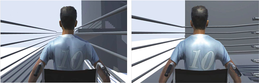 둘째, 득과 실 비교(trade-offs)를 위한 분석 및 평가과정에서 사용자의 다양성과 감정이 중요한 항목으로 고려되고, 설계편의에 관한 책임을 체감할 수 있다. 설계자는 잠재적 사용자의 신체적 특성을 선택하고, 그 신체적인 한계 내에서 설계안을 대리 경험한다. 따라서 기준화된 인체모형과 척도의 사용보다는 신체적인 다양성과 신체능력과 연관된 심리기제에 관한 문제 발견이 용이하며, 문제풀이 역시 사용자 경험에 초점이 맞춰진다. 예를 들어, BIM과 관련 법규만 사용하여 장애인 진입로를 설계했을 경우, 장애인 경사로의 물리적인 치수, 높이, 각도 등의 수치적인 항목을 중점으로 문제풀이가 이루어지지만 이 모델을 휠체어의 회전범위, 속도, 보행시야 등을 가상의 신체를 통해 경험하고, 비장애인들과 같은 진입로를 사용하는 경우에 심리적 위축감과 같은 문제를 발견할 수 있다(그림3). 이를 통해 사용자의 다양성이 디자인 프로세스에서 고려될 수 있으며, 설계자는 의사결정에 관한 책임을 자각하고 설계안 창안에 신중할 수 있다. 이번 장에서는 가상의 신체와 사용자 경험 중심의 디자인 프로세스의 특징을 살펴보았다. 다음 장에서는 사용자의 사회심리기제가 연산될 경우에 디자인 프로세스가 가지는 특징을 소개한다.