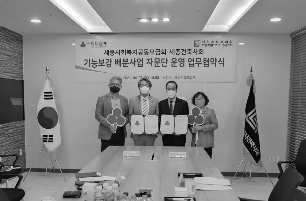 세종특별자치시건축사회는 4월 8일 세종시건축사회관에서 세종사회공동복지모금회와 기능보강 배분사업 자문단 운영 업무협약식을 가졌다. 이날 김승태 세종시건축사회장, 유병구 건축사와 홍영섭 세종사회복지공동모금회 회장 등이 참석한 가운데, 세종시민의 소중한 성금이 투명하고 공정하게 집행될 수 있도록 최선을 다하는 것을 목적으로 업무협약이 체결됐다.