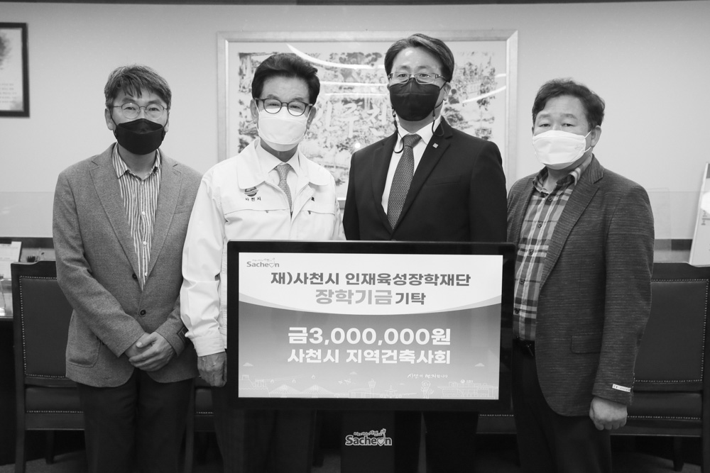 경상남도건축사회 사천지역건축사회는 4월 28일 사천시청을 방문해 (재)사천시인재육성장학재단에 장학금 300만 원을 기탁했다. 사천지역건축사회는 지역의 인재 양성을 위해 지난 2009년부터 장학금을 기탁해오고 있으며, 현재까지 총 1,300만 원을 인재육성장학재단에 기부했다. 특히 사천지역건축사회는 2015년 사천시와 청렴협약을 체결한 바 있으며, 건축직 공무원과 건축사가 상호신뢰를 바탕으로 투명한 건축행정을 구현해오고 있다. 정홍진 사천지역건축사회장은 “사천시에 도움이 될 수 있는 일을 해서 기쁘다”며, “사천시 인재들이 역량을 개발해 지역사회 발전에 기여할 수 있는 훌륭한 인물들이 되길 바란다”고 당부했다.