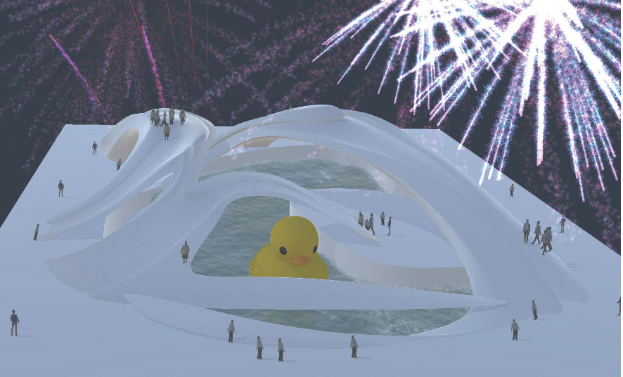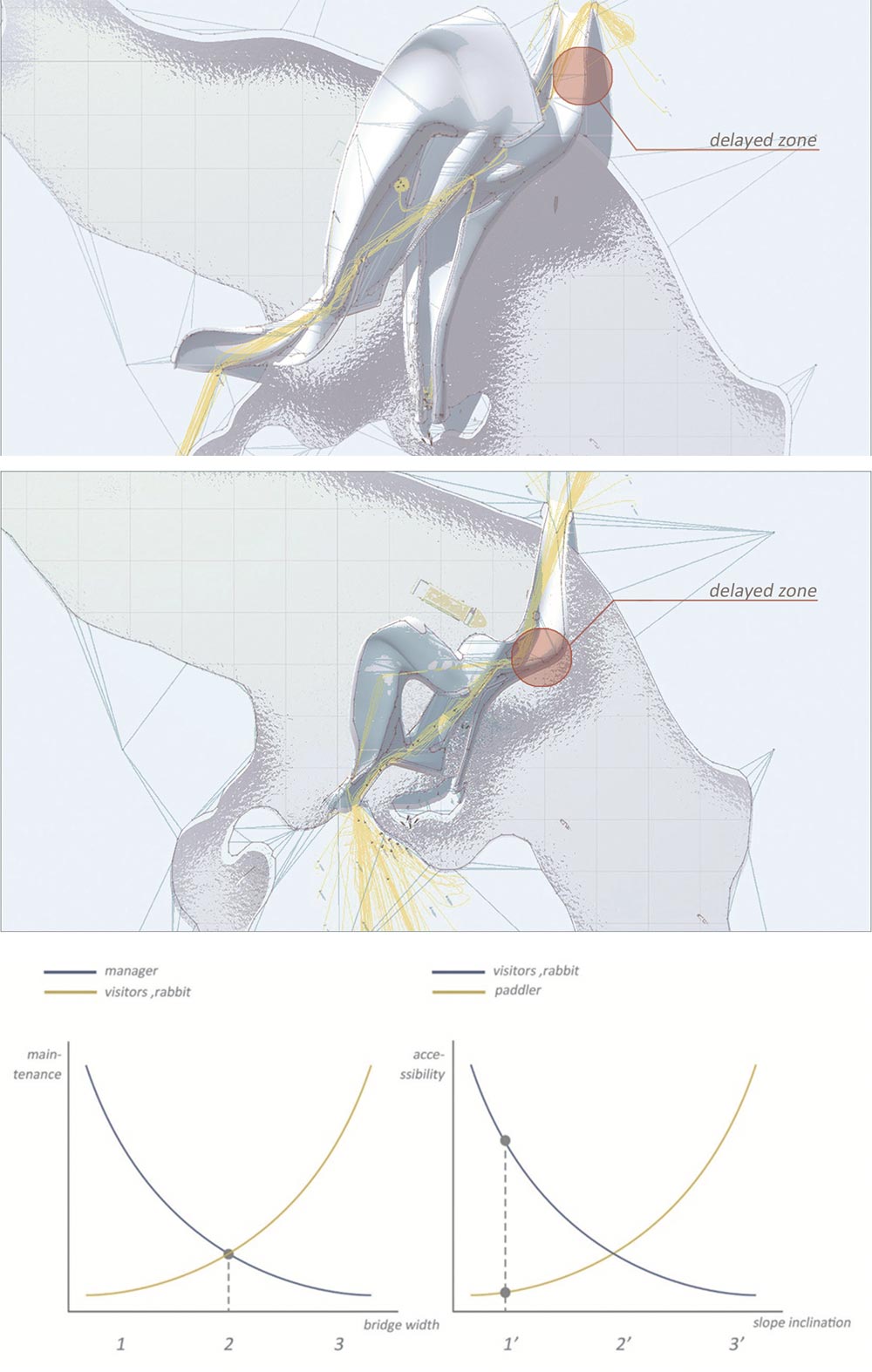 둘째, 서로 다른 개성과 사회성, 목적을 가진 사용자가 분포되므로, 설계안을 사용하는 방식이 상충되어 발생하는 문제를 발견할 수 있다. 또한, 다양한 사용자 그룹의 요구를 만족시키는 설계안을 탐구하는 과정이 디자인 프로세스에 포함될 수 있다. 예를 들어, 비정형의 수변공원을 설계하는 학생들은 성인남자, 여자, 어린이, 노인 그룹으로 잠재적인 사용자를 설정하고, 사용자를 공원 사용 목적, 사용자 그룹 간의 사회적 행동, 공원에서 발생하는 행사에 관한 선호도를 다양하게 분포했다. 학생들은 사용자 그룹 사이의 건축물 사용이 상충되는 상황을 시뮬레이션 해 그룹 간의 만족도 지표(예를 들어, 교가를 지나갈 수 있는 보행자 수, 수변에서 물놀이를 할 수 있는 어린이 수, 불꽃놀이 같은 행사를 구경할 수 있는 사람의 수)가 가장 높은 설계안을 제시했다(그림5). 또 다른 예에서 학생들은 소규모 동물들이 서식하는 섬과 육지를 연결하는 다리를 설계했는데, 사용자 그룹은 관람객과 관리자로 동물관람과 관리에 관한 목적과 선호도가 상충된다. 학생들은 다리의 크기 및 경사도와 탈출하는 동물의 수, 관람빈도, 보행거리 등의 관계를 분석하여, 관람, 접근, 관리의 다양한 용도가 동시에 만족되는 설계안을 발견했다(그림6).