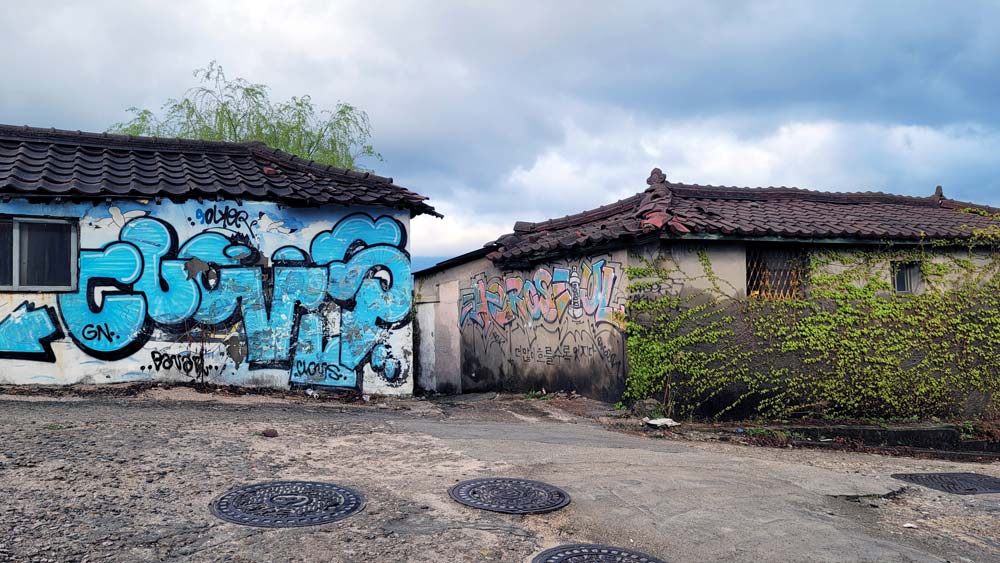 다시 골목길을 따라 아래로 내려오다 보니 옹기종기 화분에 심어진 파와 부추가 파릇파릇하다. 얼마 후면 빈 화분에도 고추와 호박 모종이 심어질 것이다. 마을을 벗어날 즈음, 하얀 페인트칠이 반쯤 벗겨진 건물 벽에 누군가 노랗고 빨간 꽃들을 어설프게 그려 놓은 것이 눈에 띈다.
