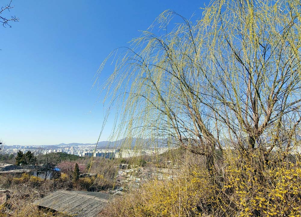 이곳은 주로 연탄을 때느라 굴뚝으로 연기가 피어오르고 집 앞에는 연탄재가 쌓여있다. 동네에서 가장 높은 언덕에 올라서니 폐허처럼 변해버린 집 앞에 연둣빛으로 물이 오른 수양버들이 바람에 하늘거린다. 그 아래엔 샛노란 개나리가 무리 지어 꽃을 피우고 있었다. 그리고 게딱지 같은 납작 지붕 너머로 고층아파트들이 딴 세상처럼 보이고 또 그 너머로 북한산이 보인다.