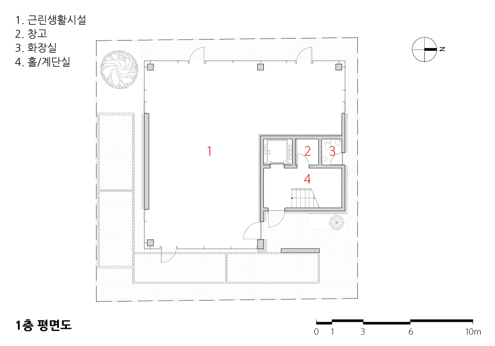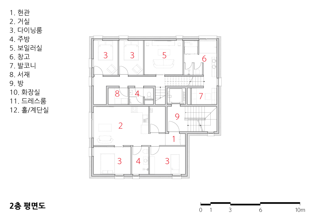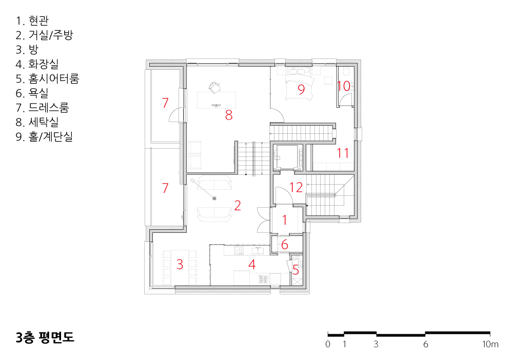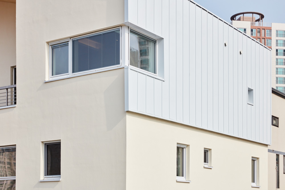 과거 해외 여러 곳에서 거주했던 건축주 부부는 아파트가 아닌 새로운 보금자리를 희망하고 있었다. 1층은 상가, 2층은 어머님과 간병인을 위한 공간으로 항상 밝은 분위기의 공간으로 계획되었다. 3층은 건축주 부부를 위한 공간과 딸들을 위한 영역과 홈시어터 룸, 사우나실 등 다양한 실들을 필요로 하였다. 이를 위해 스킵플로어 형태로 구성하였는데 자녀방과 공용욕실, 부부욕실로 구성된 아래층과 부부침실과 취미실로 구성된 위층 사이는 반 층 높이차로 접근 가능한 거실과 주방, 식당이 위치한다. 여기에 부부침실에서 부부욕실로 향하는 전용 계단을 설치하여 공간에 변화를 주고 있다. 이러한 프로그램들은 공간 이용의 편리성과 동선을 고려하여 입체적으로 조성되었다.