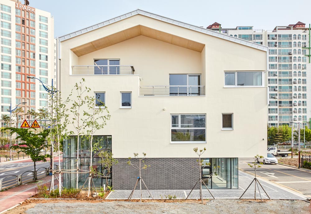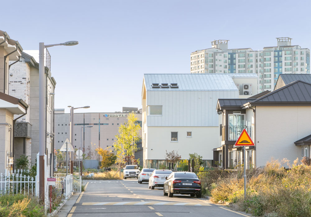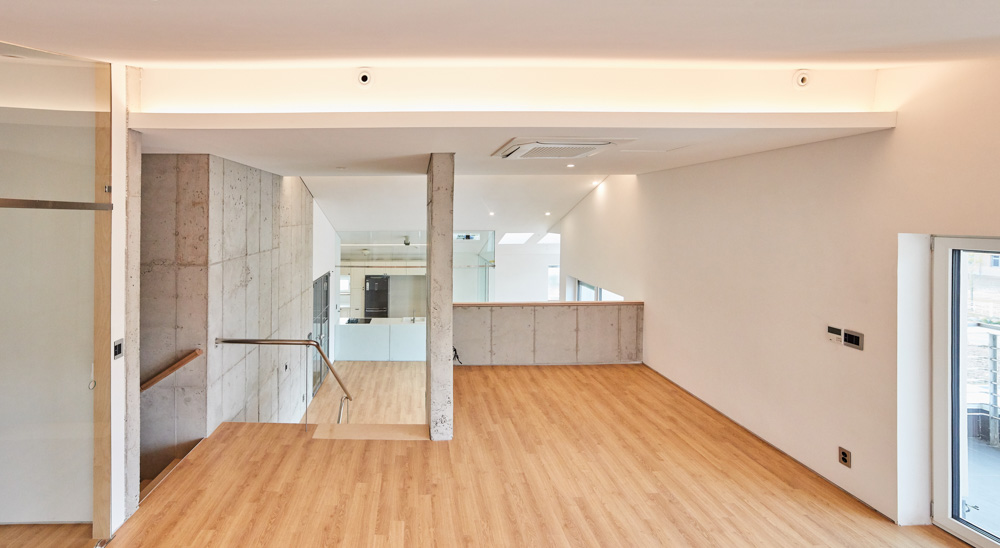 과거 해외 여러 곳에서 거주했던 건축주 부부는 아파트가 아닌 새로운 보금자리를 희망하고 있었다. 1층은 상가, 2층은 어머님과 간병인을 위한 공간으로 항상 밝은 분위기의 공간으로 계획되었다. 3층은 건축주 부부를 위한 공간과 딸들을 위한 영역과 홈시어터 룸, 사우나실 등 다양한 실들을 필요로 하였다. 이를 위해 스킵플로어 형태로 구성하였는데 자녀방과 공용욕실, 부부욕실로 구성된 아래층과 부부침실과 취미실로 구성된 위층 사이는 반 층 높이차로 접근 가능한 거실과 주방, 식당이 위치한다. 여기에 부부침실에서 부부욕실로 향하는 전용 계단을 설치하여 공간에 변화를 주고 있다. 이러한 프로그램들은 공간 이용의 편리성과 동선을 고려하여 입체적으로 조성되었다.