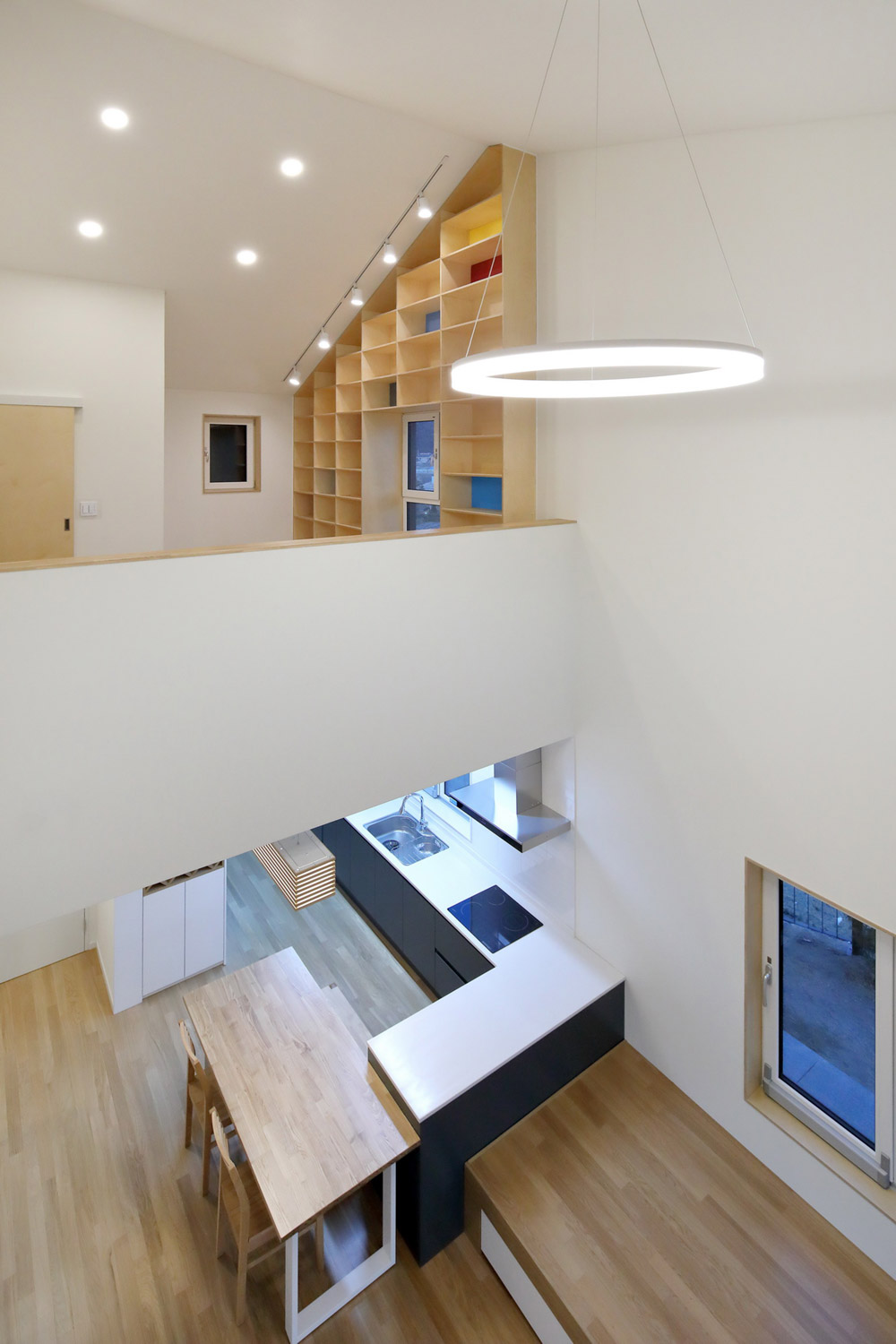 The mixed form does not simply distinguish space. There are overlapping "windows" that span each other's space and stairs connecting the layers on the overlapping side.