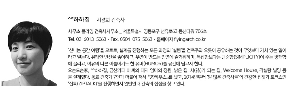 | ^^하하집 설계자 | 서경화 _ 플라잉 건축사사무소 건축주 | 김헌남 감리자 | 서경화 _ 플라잉 건축사사무소 시공사 | 케이에스하우징 대지위치 | 경기도 양평군 양서면 청계길57번길 34 주요용도 | 단독주택 대지면적 | 394.00㎡ 건축면적 | 92.13㎡ 연면적 | 150.16㎡ 건폐율 | 23.38% 용적률 | 38.11% 규모 | 지상 2층 구조 | 경골목구조 외부마감재 | 치장벽돌(다다벽돌 : 레드토석SS) 내부마감재 | 도배지, 강마루, 타일 설계기간 | 2017. 04 – 2017. 09 공사기간 | 2017. 09 – 2018. 01 사진 | 송정근 구조분야 : (주)두항구조안전기술사사무소 기계설비분야 : (주)코담기술단 전기분야 : 시엔에스엔지니어링 |