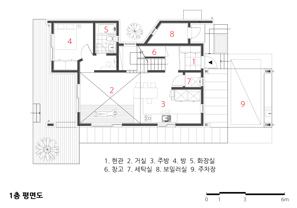 이는 사적인 영역은 보호하되 가족이 서로 대화할 수 있도록 1, 2층의 오픈된 공간을 통해 소통이 가능하도록 유도하는 장치이다.