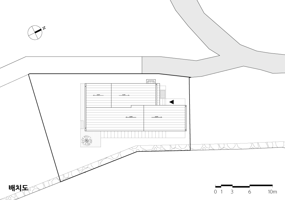 동측면의 긴 ‘ㅅ’자 공간은 거실, 주방/식당, 서재 등 가족이 모일 수 있는 공적공간이고, 서측면의 긴 ‘ㅅ’자 공간은 사적인 침실이 자리한다.