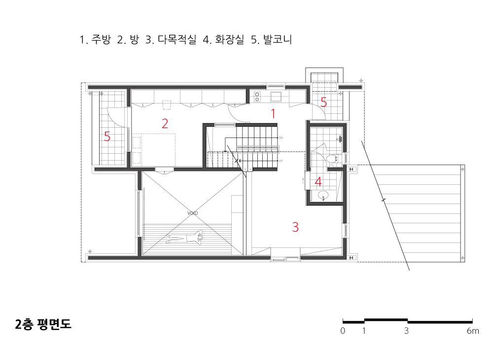 이는 사적인 영역은 보호하되 가족이 서로 대화할 수 있도록 1, 2층의 오픈된 공간을 통해 소통이 가능하도록 유도하는 장치이다.