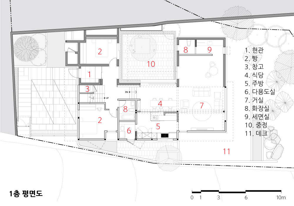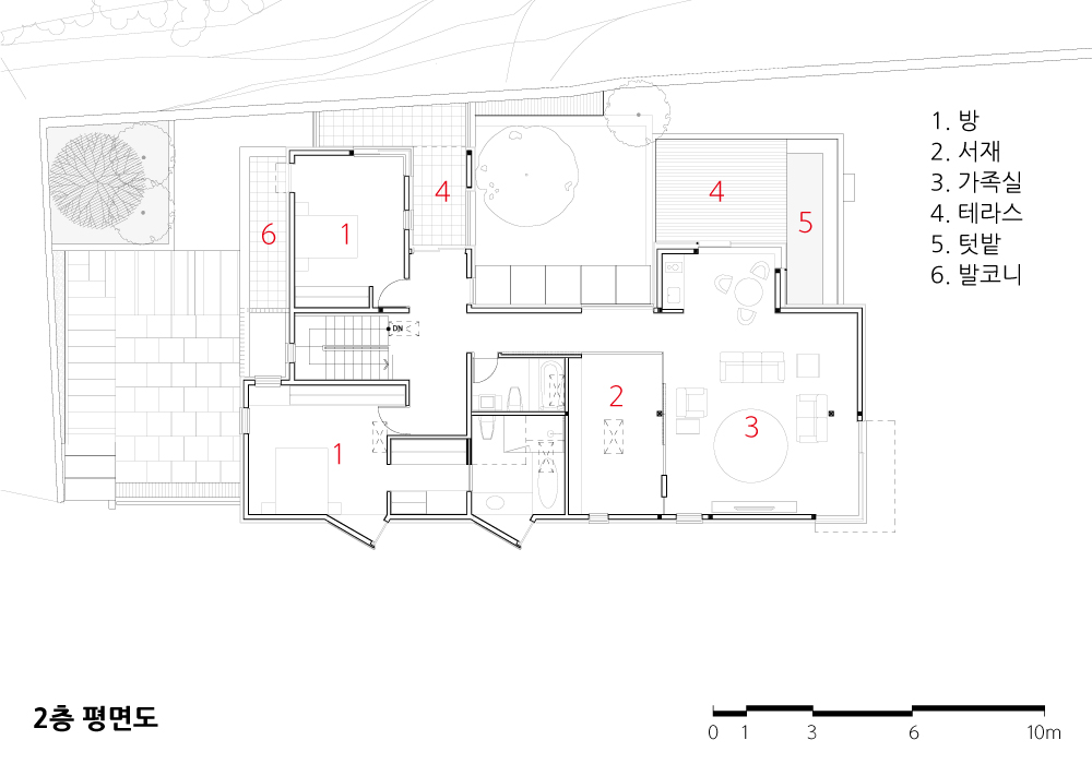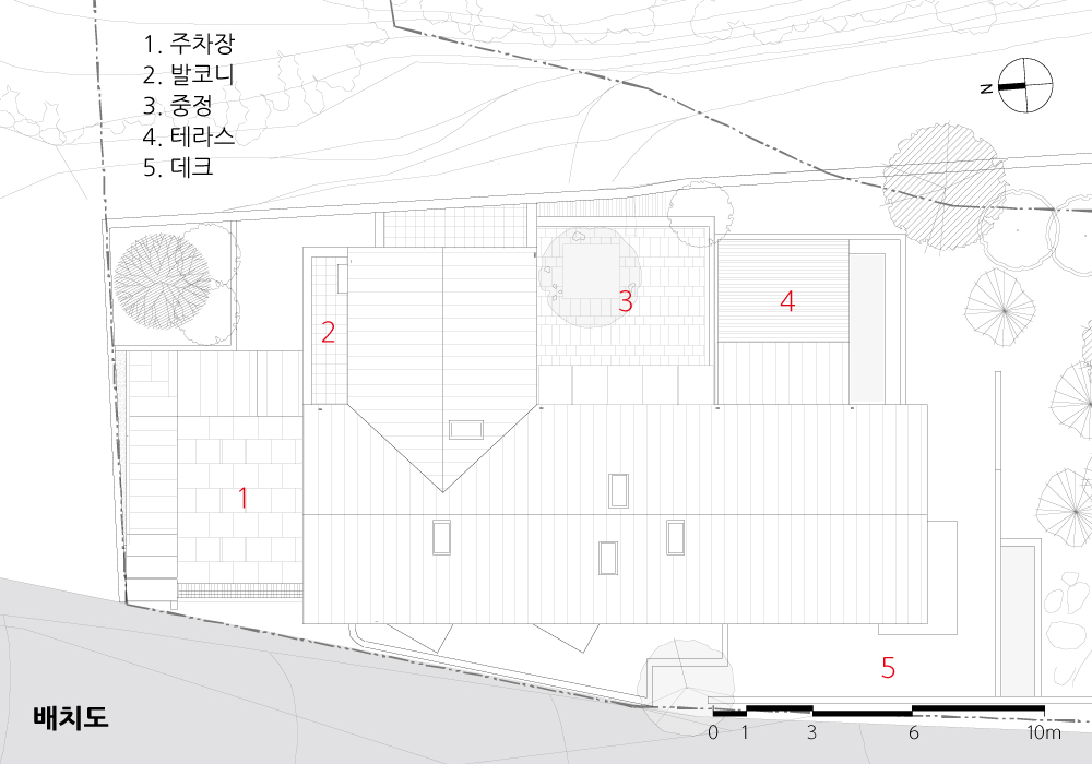 먼저, 대지에 순응하여 높낮이를 나눠 두 개의 영역으로 분절하고 사이를 비워내는 것으로부터 계획을 시작한다. 남북방향으로 장방형인 터라 채광에 불리한 조건을 두 개 영역 사이에 중정(中庭)을 두어 비워내었다. 중정과 면해 연속하여 흐르는 복도를 따라 내부공간으로 연결되는 중정을 둘러싼 곳곳의 테라스 외부공간은, 일상 속에서 자연과 부단히 교감할 수 있는 조건이 된다.